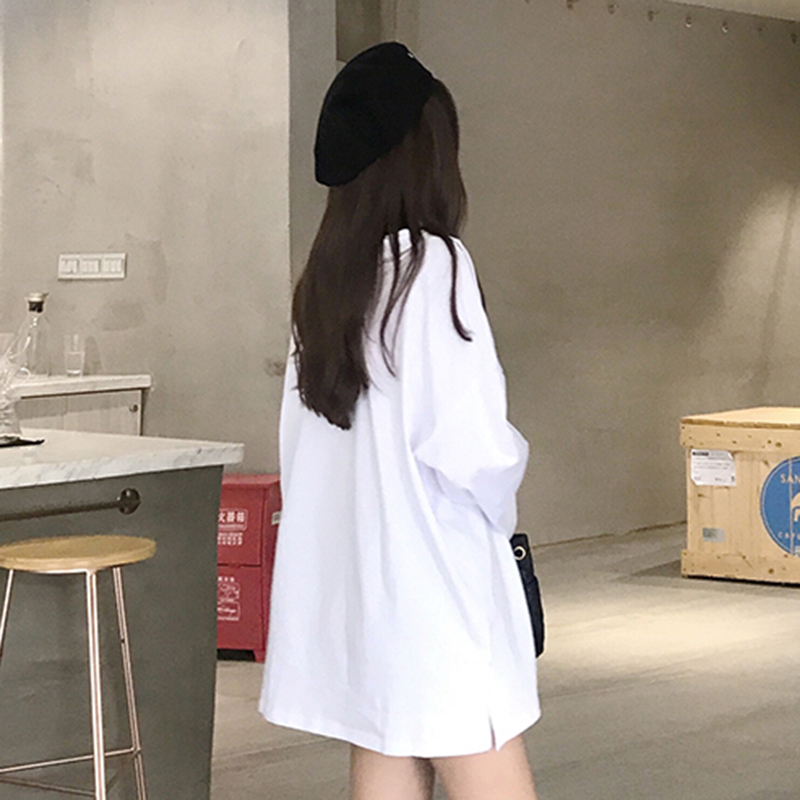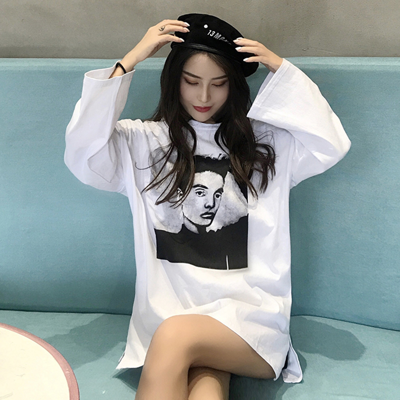 時尚人物印花T恤女秋裝新款圓領寬松長袖體恤開叉中長款休閑上衣
