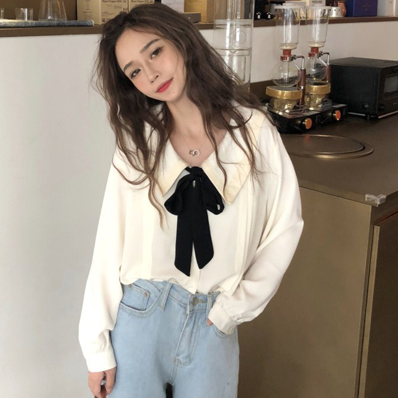 / 秋裝新款女裝撞色蝴蝶結綁帶娃娃領襯衫學院風寬松長袖襯衣上衣潮