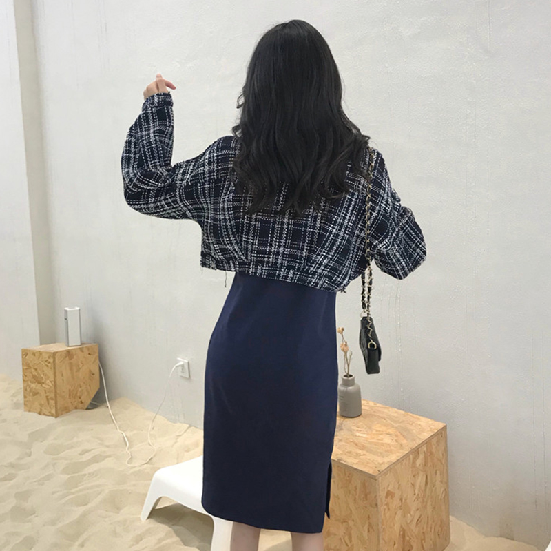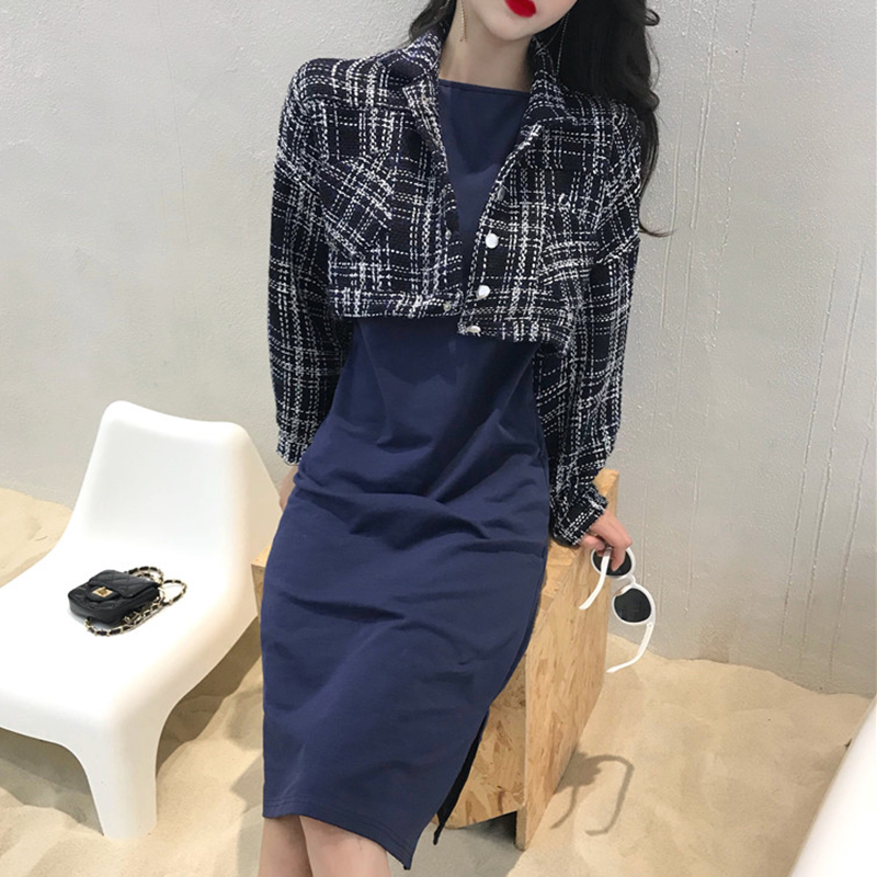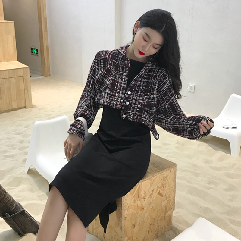 / 兩件套裝女秋新款復古格子長袖毛呢短外套修身顯瘦開叉吊帶連衣裙