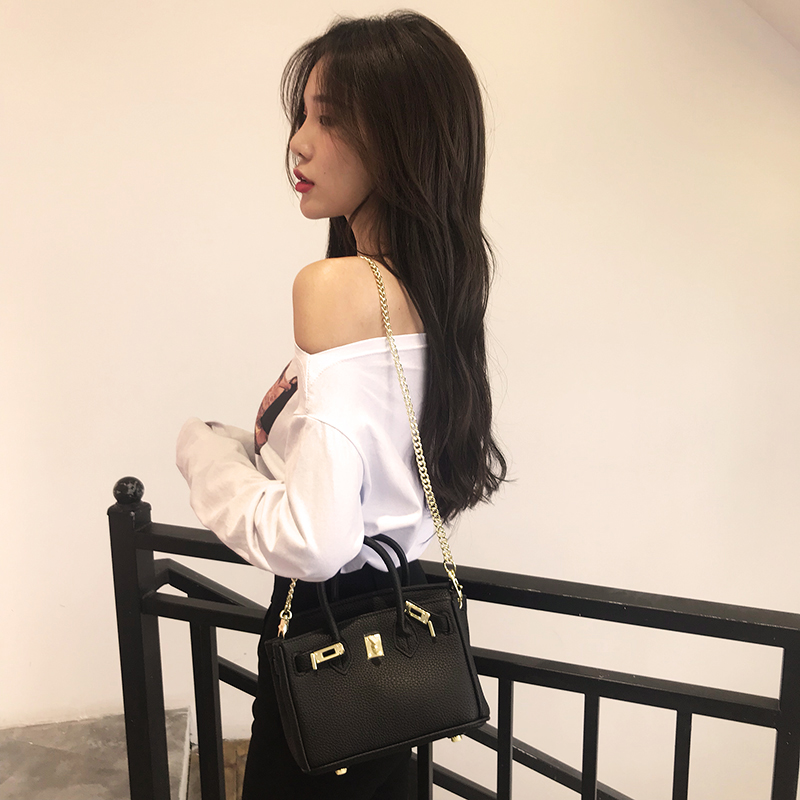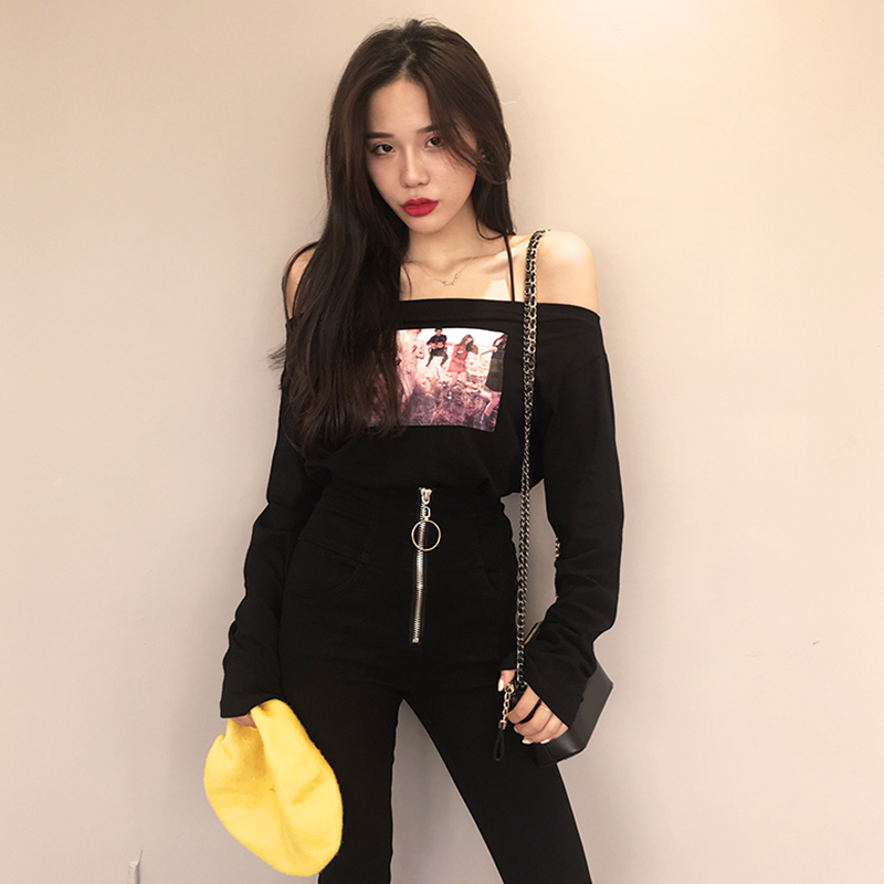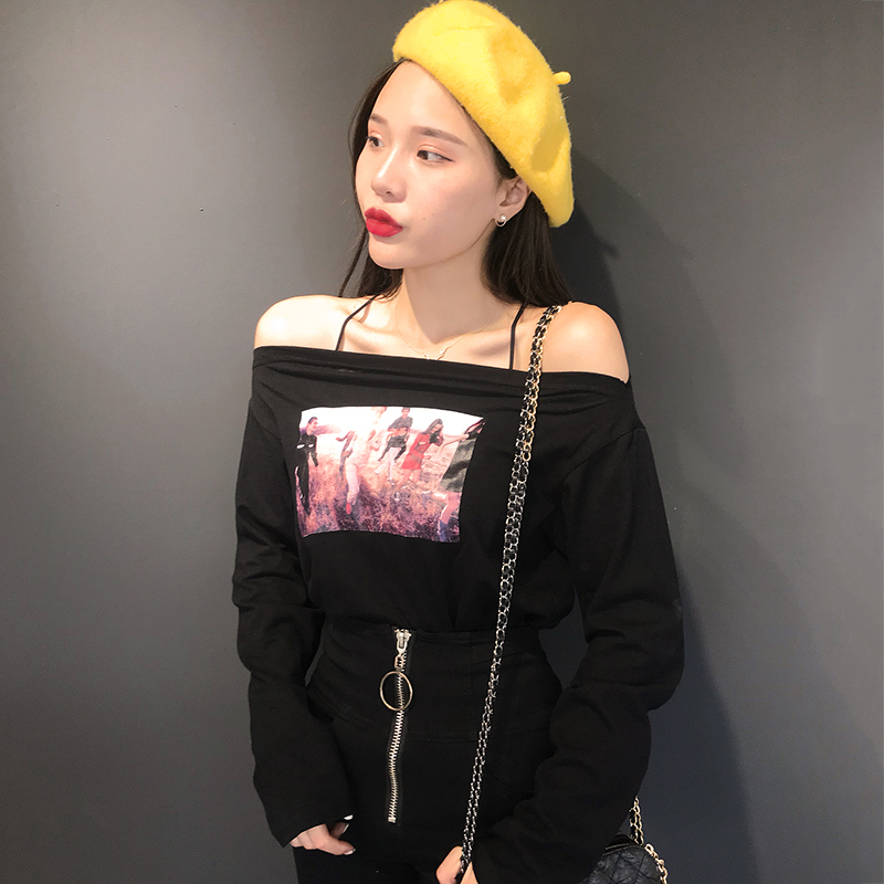 / 女2018新款韓版港味印花長袖T恤一字露肩寬松黑色上衣時尚秋裝潮