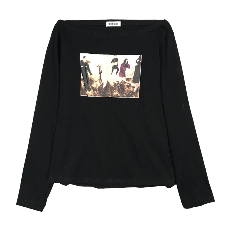 女2018新款韓版港味印花長袖T恤一字露肩寬松黑色上衣時尚秋裝潮