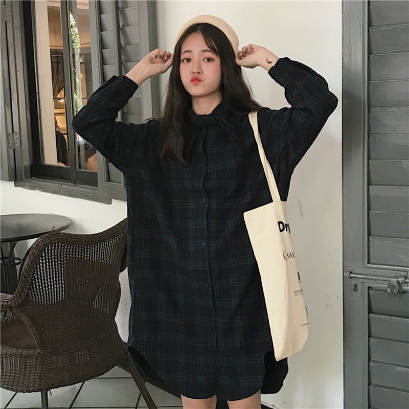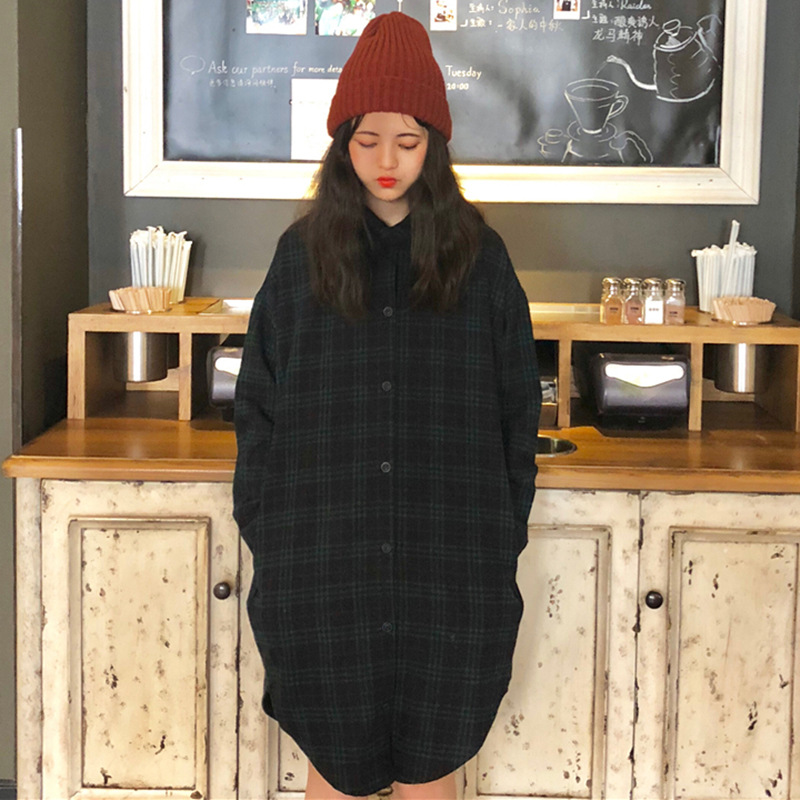 / 秋冬女裝2018新款中長款襯衫式連衣裙韓版領口系帶長袖格子egg裙