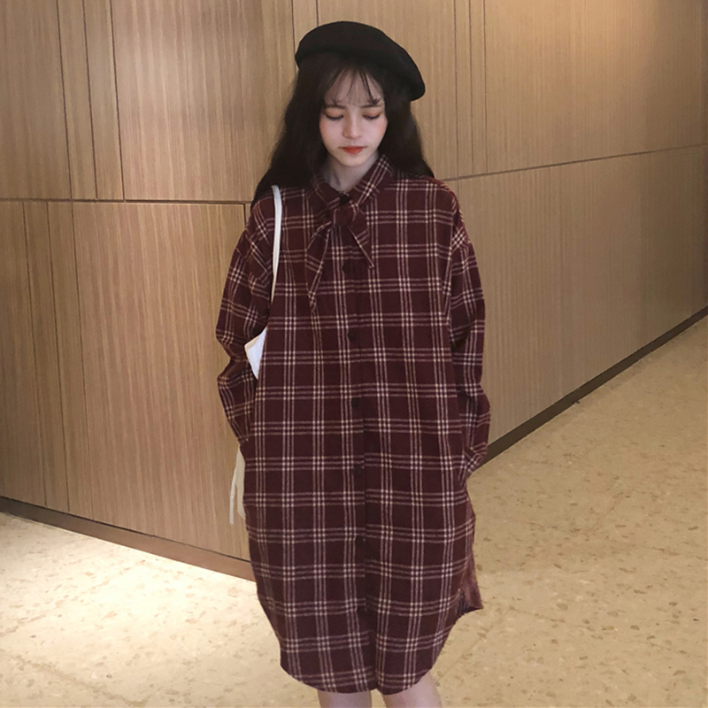 秋冬女裝2018新款中長款襯衫式連衣裙韓版領口系帶長袖格子egg裙