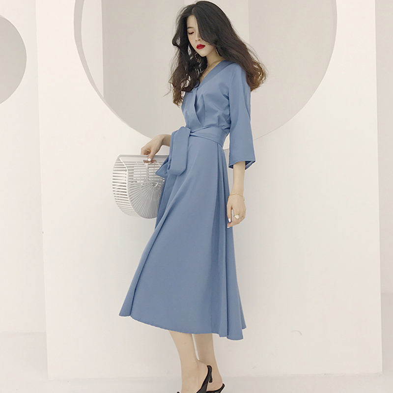/ 早秋復古女裝2018新款氣質收腰中長款連衣裙中袖V領A字裙大擺裙子