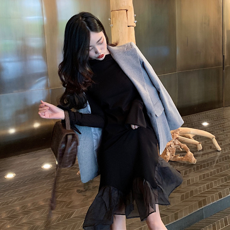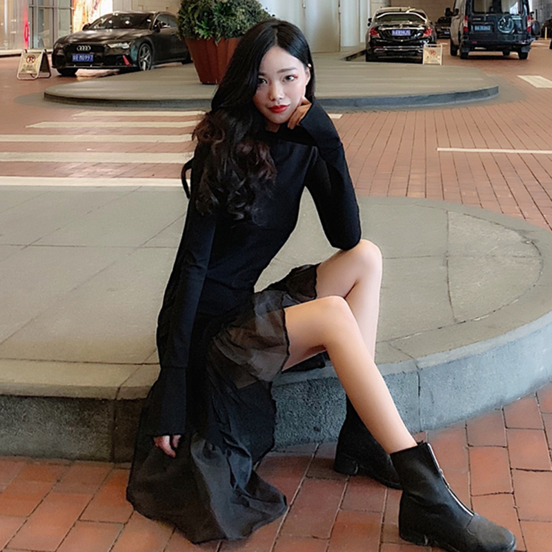 / 連衣裙女秋冬裝2018新款網紗拼接魚尾長袖打底裙黑色高腰中長裙子