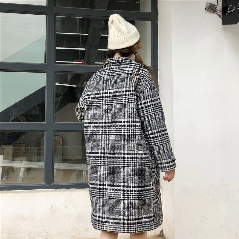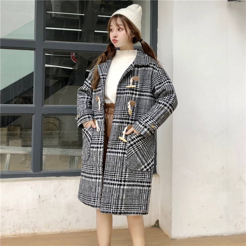/ 復古格子流行呢子大衣女秋冬裝新款韓版中長款寬松牛角扣毛呢外套