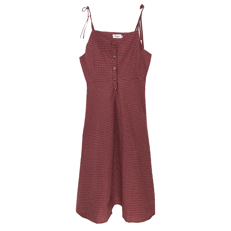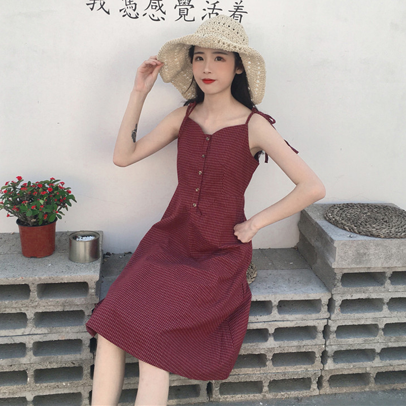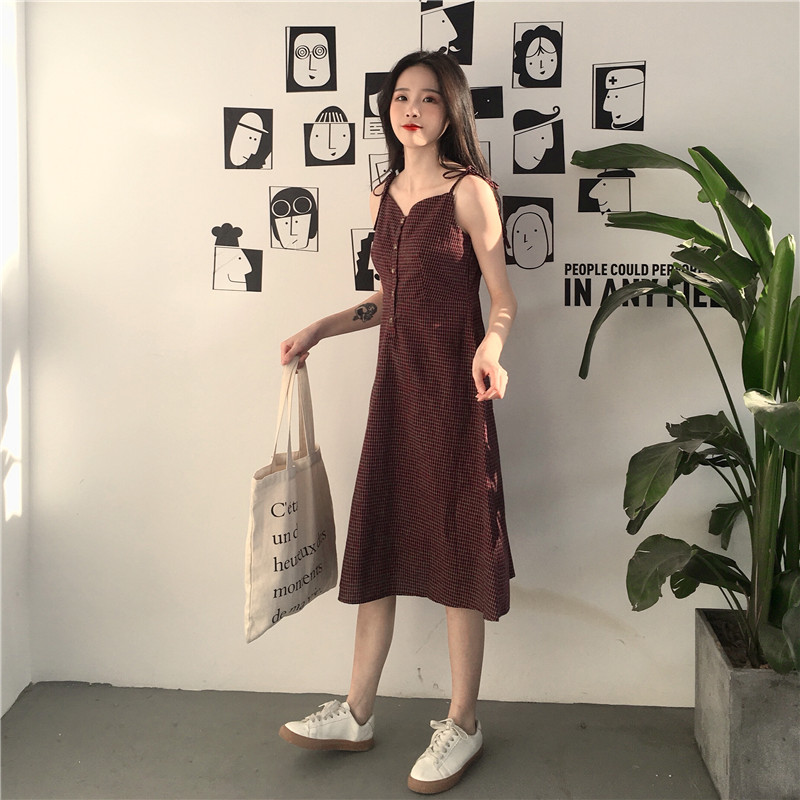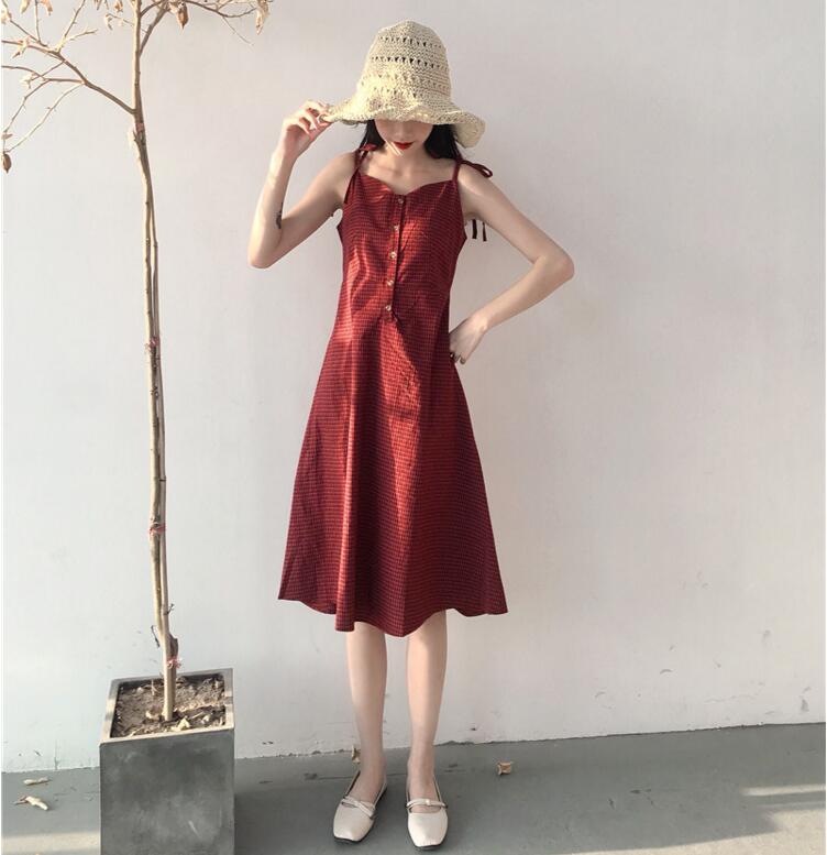/ 夏季女裝新款氣質復古格子中長裙子學生單排扣吊帶V領打底連衣裙