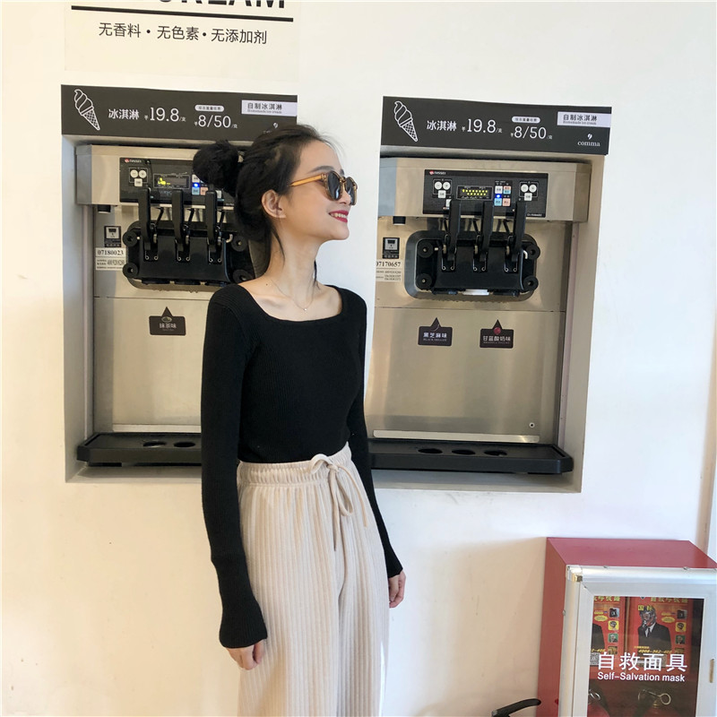 / 秋冬亮色顯白加厚方領打底衫內搭毛衣+百搭松緊腰闊腿針織褲套裝
