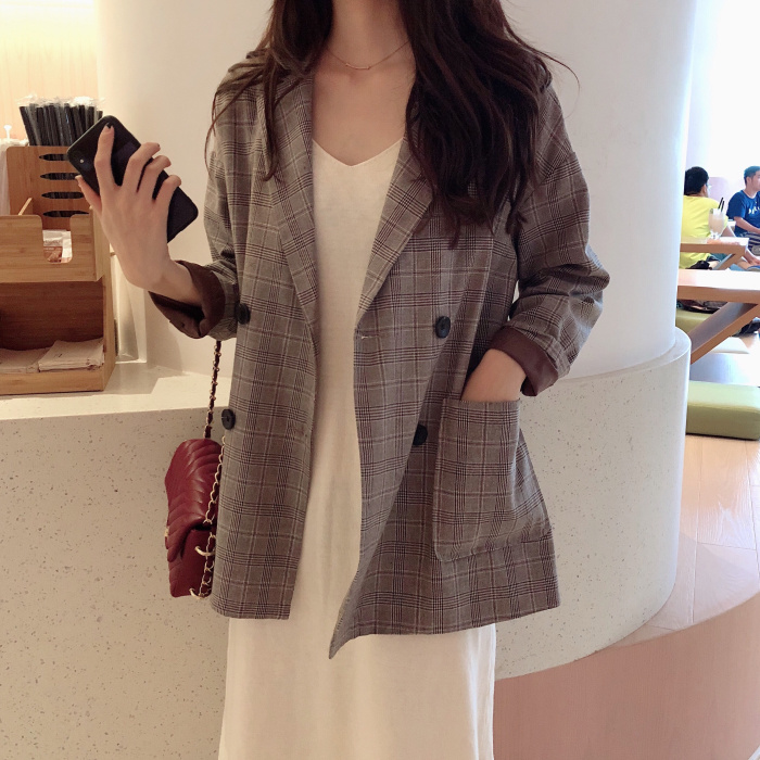 韓版時尚外套女春秋新款格紋西服寬松復古中長款格子小西裝上衣潮