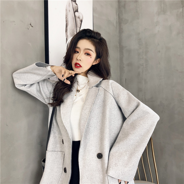 / 外套女春秋2018新款韓版百搭氣質雙排扣西服領寬松中長款毛呢外套