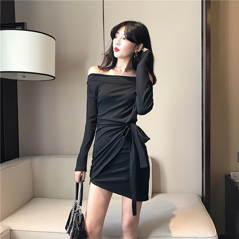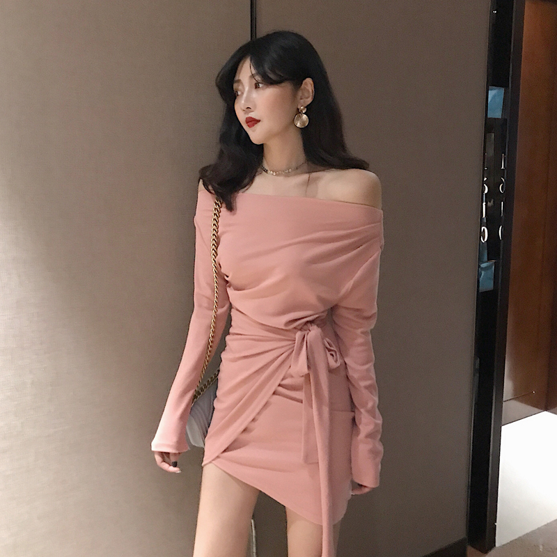 女秋裝2018新款裙子韓版氣質百搭修身顯瘦不規則綁帶露肩連衣裙潮