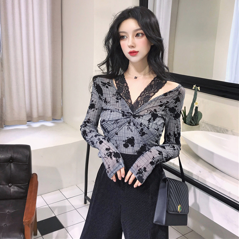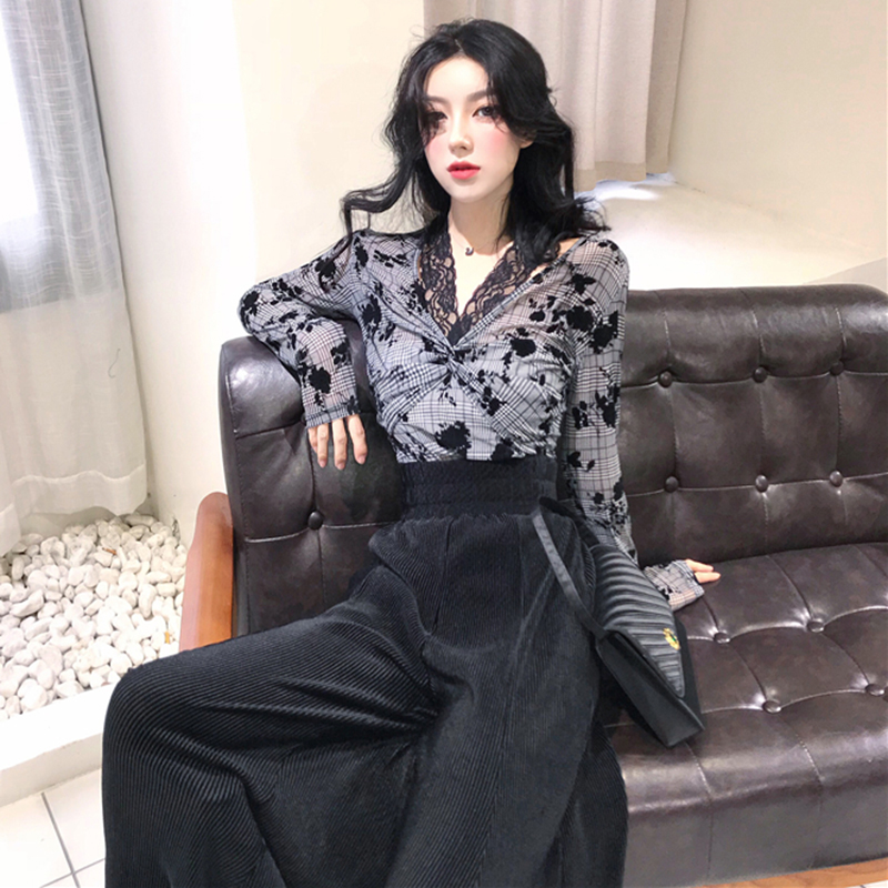 / 洋氣套裝女秋冬裝2018新款蕾絲掛脖扭結v領T恤高腰垂感喇叭長褲子