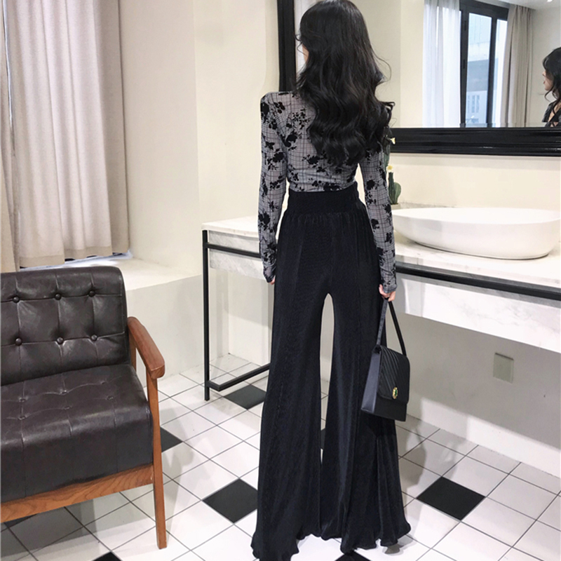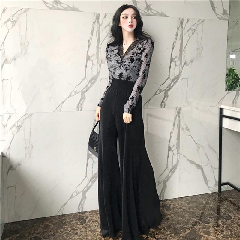 洋氣套裝女秋冬裝2018新款蕾絲掛脖扭結v領T恤高腰垂感喇叭長褲子