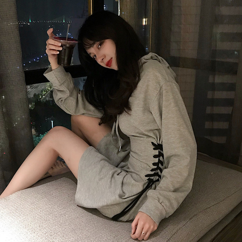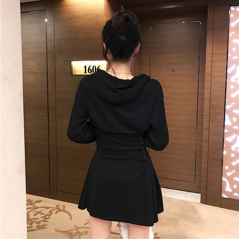 / 時尚綁帶修身顯瘦A字短裙子秋冬女裝新款學生連帽黑色長袖連衣裙