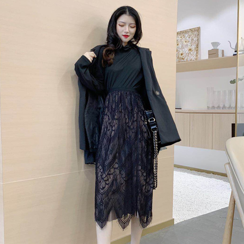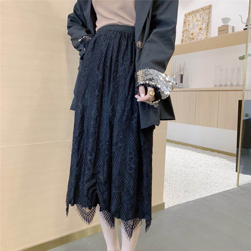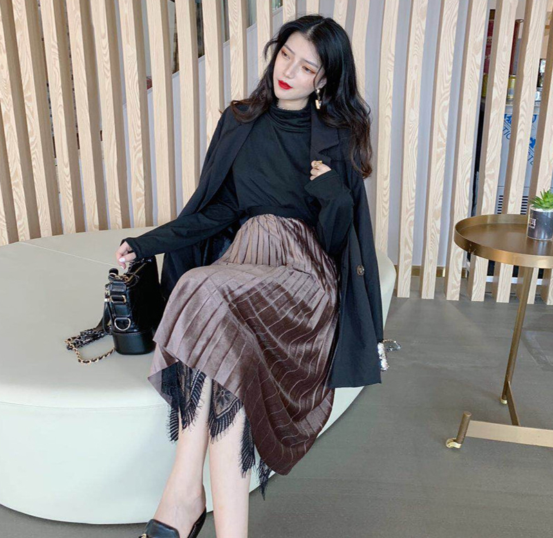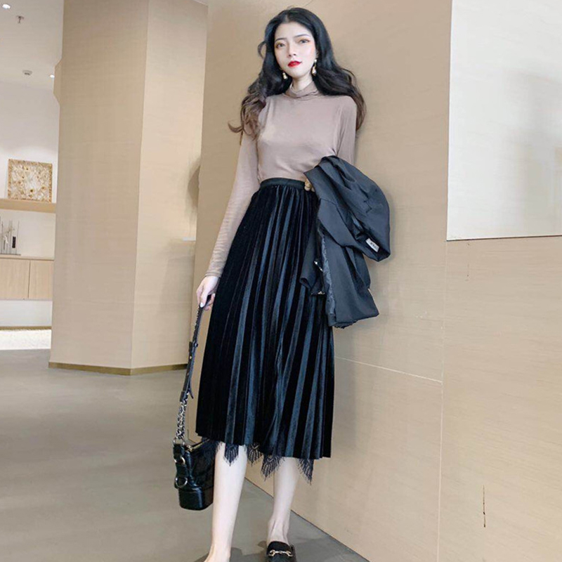 絲絨蕾絲兩面穿秋冬女裝2018新款顯瘦高腰a字半身裙時尚百褶裙子
