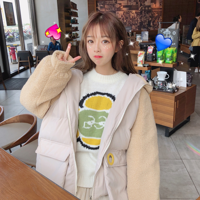 學院風拼接羊羔毛棉衣女秋冬裝2018新款韓版時尚寬松加厚連帽外套