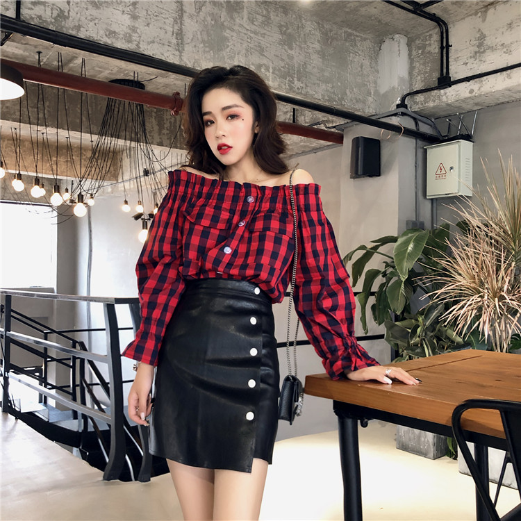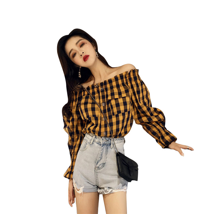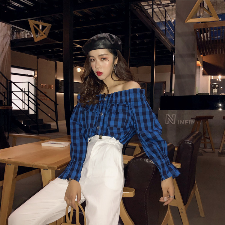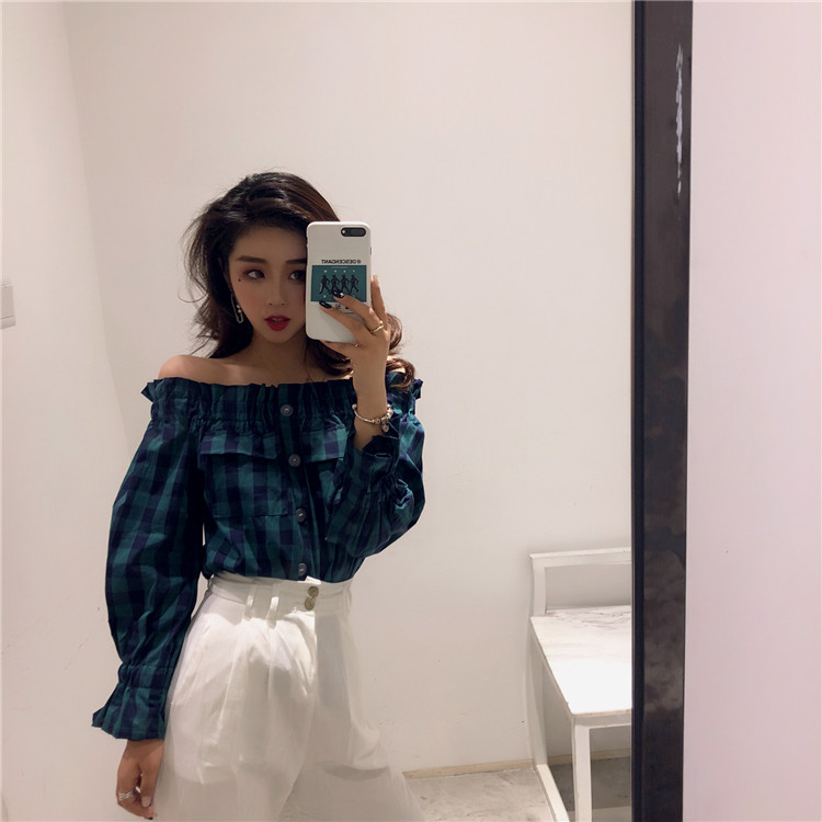 復古韓國chic風時尚古格子一字領喇叭袖襯衫秋裝女2018新款上衣潮