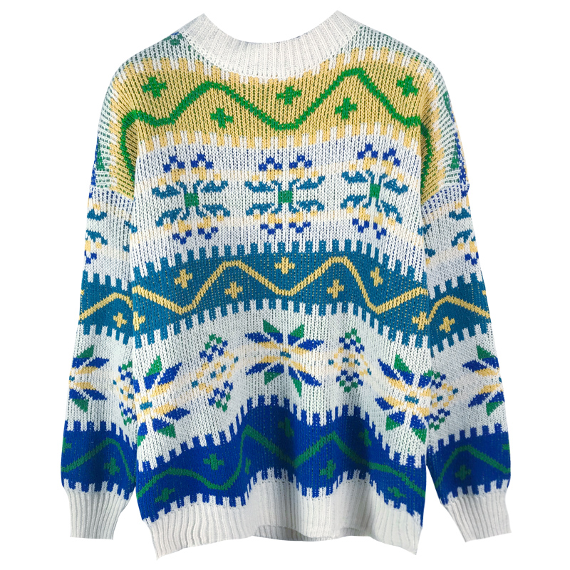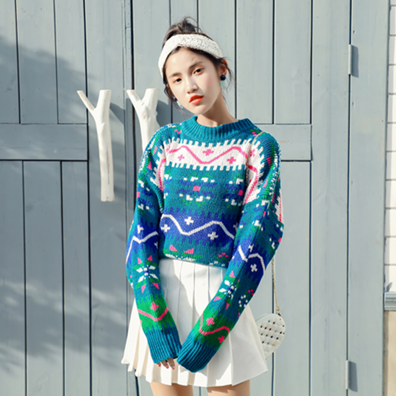時尚提花圓領慵懶毛衣秋裝女2018新款寬松長袖套頭針織衫休閑上衣