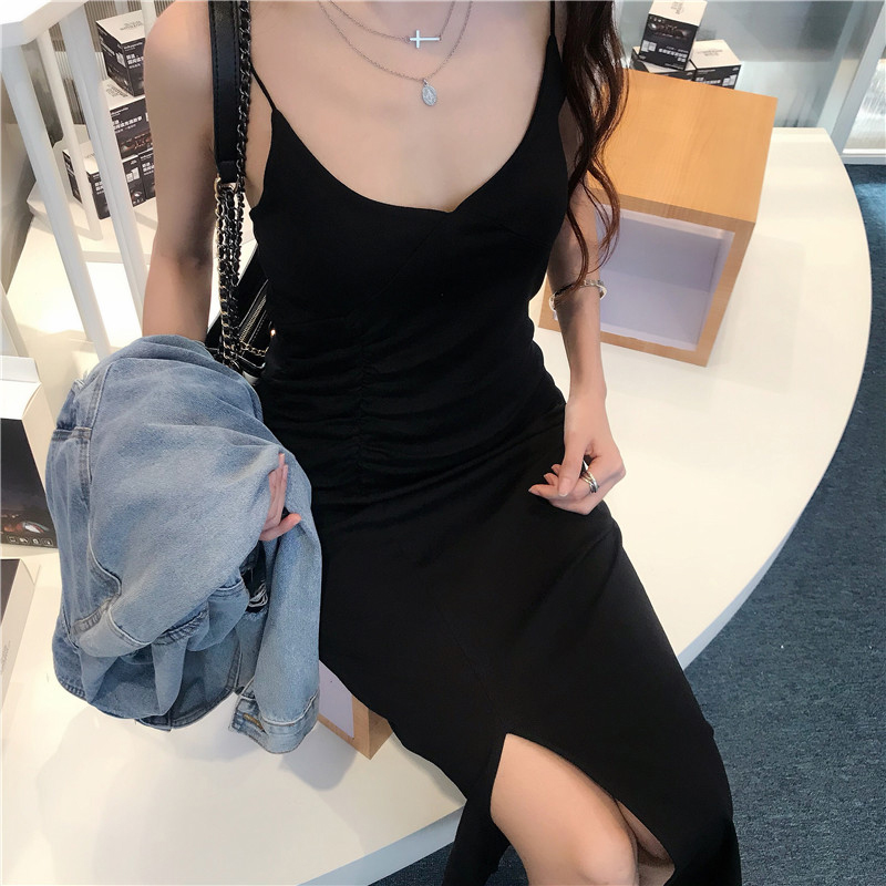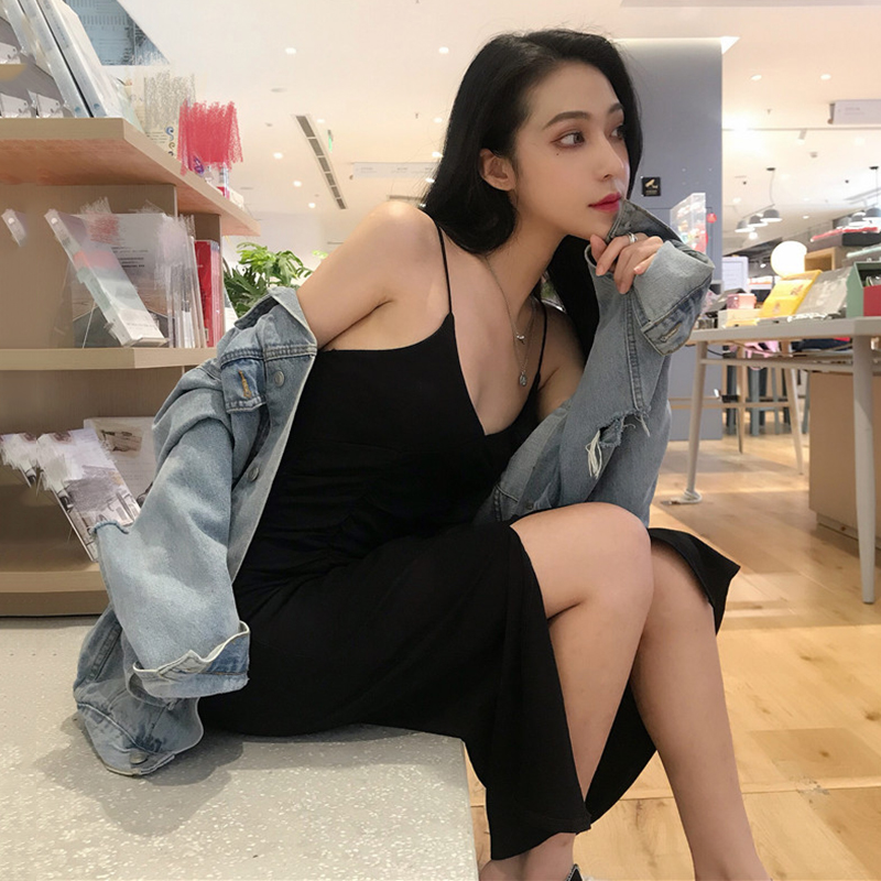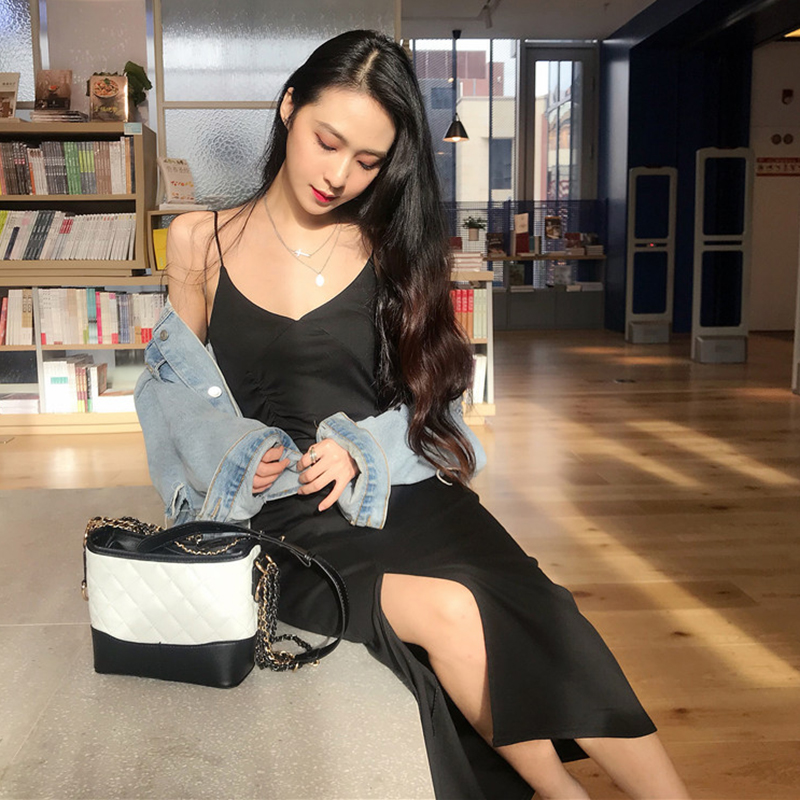 溫柔風時尚小黑裙秋裝女2018新款氣質打底吊帶連衣裙開叉中長裙子