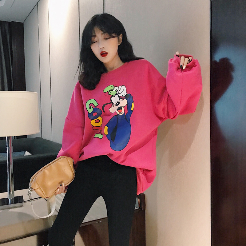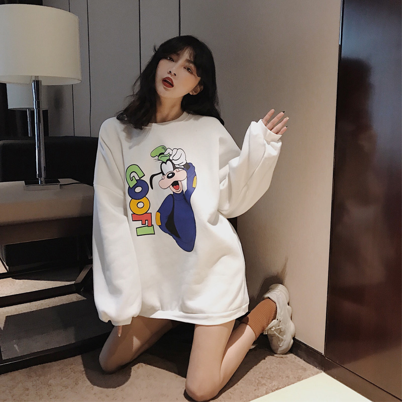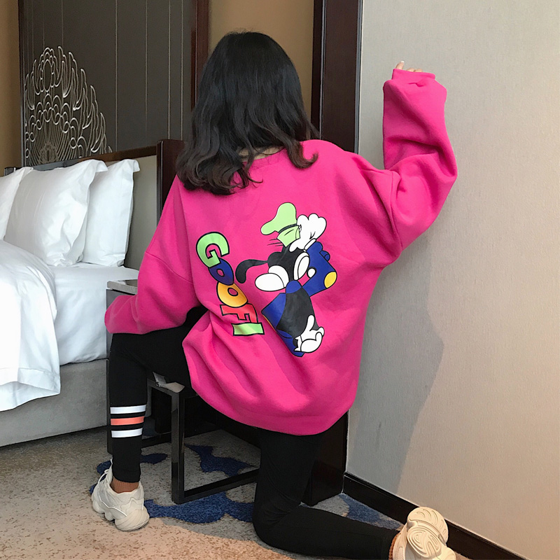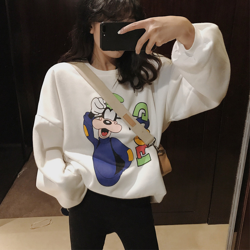 秋冬韓版卡通時尚慵懶風休閑寬松圓領燈籠袖加絨衛衣女2018新款潮