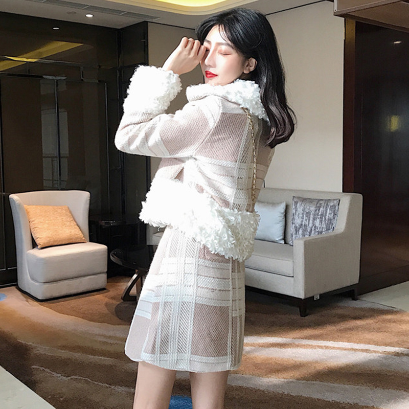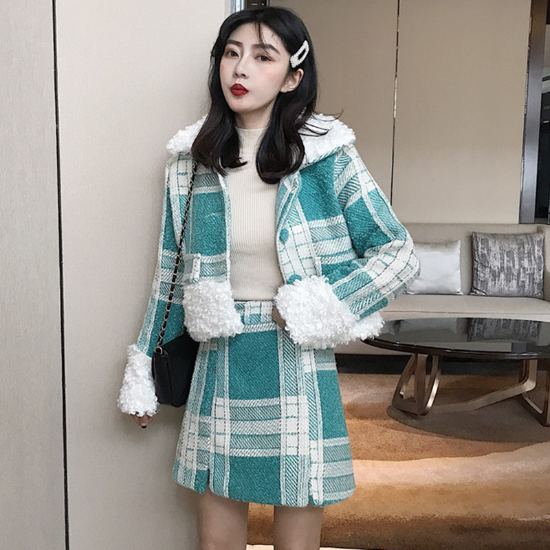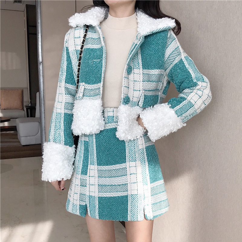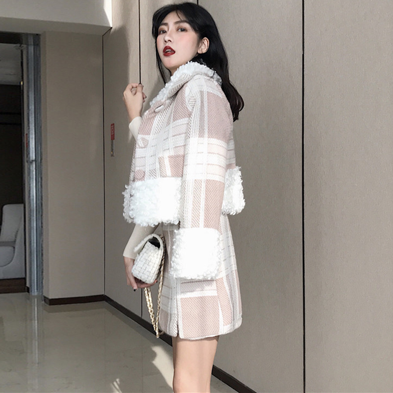 / 赫本風套裝女秋冬新款打底衫羊羔毛拼接格紋呢子短外套毛呢半身裙