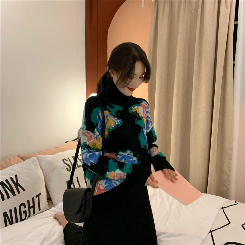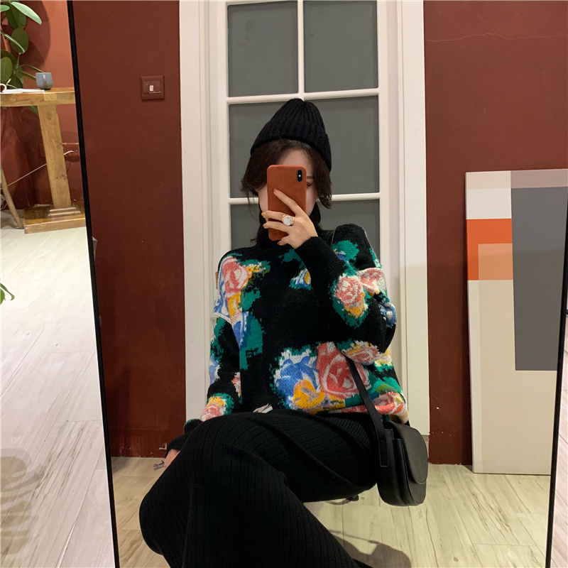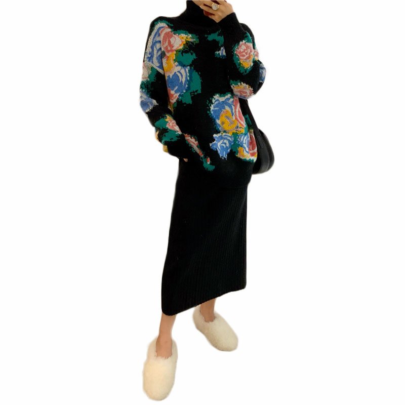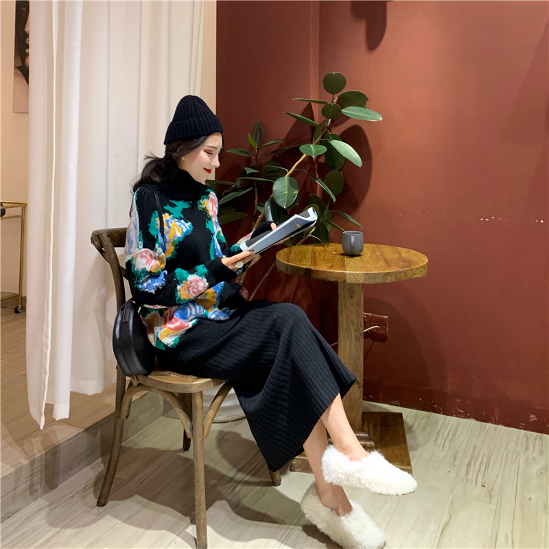 寬松復古花朵慵懶風高領毛衣女秋冬2018新款+百搭高腰針織半身裙