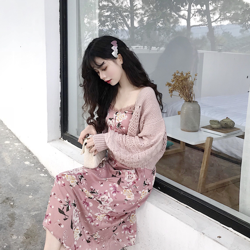 / 氣質優雅印花長款吊帶蕾絲連衣裙女+復古鏤空燈籠袖短款毛衣開衫