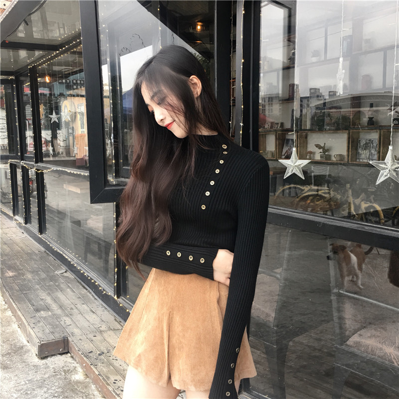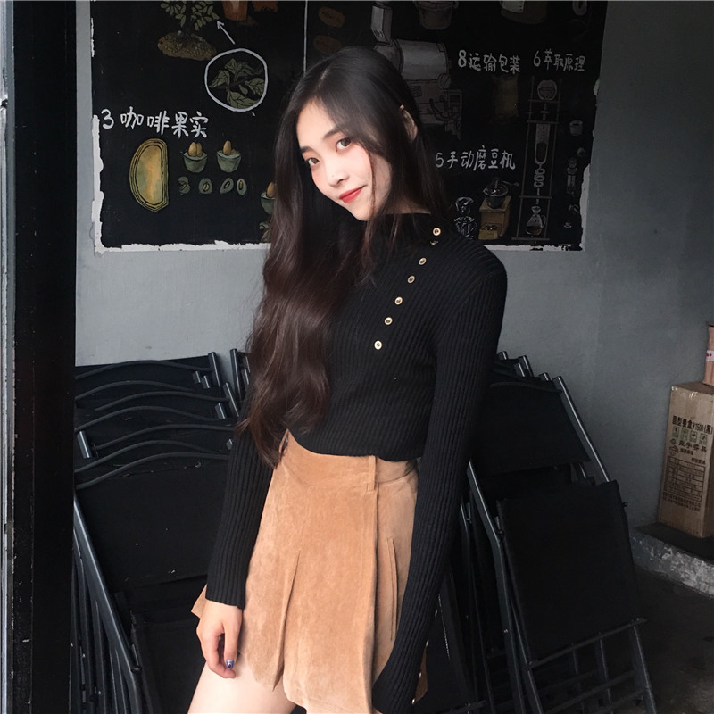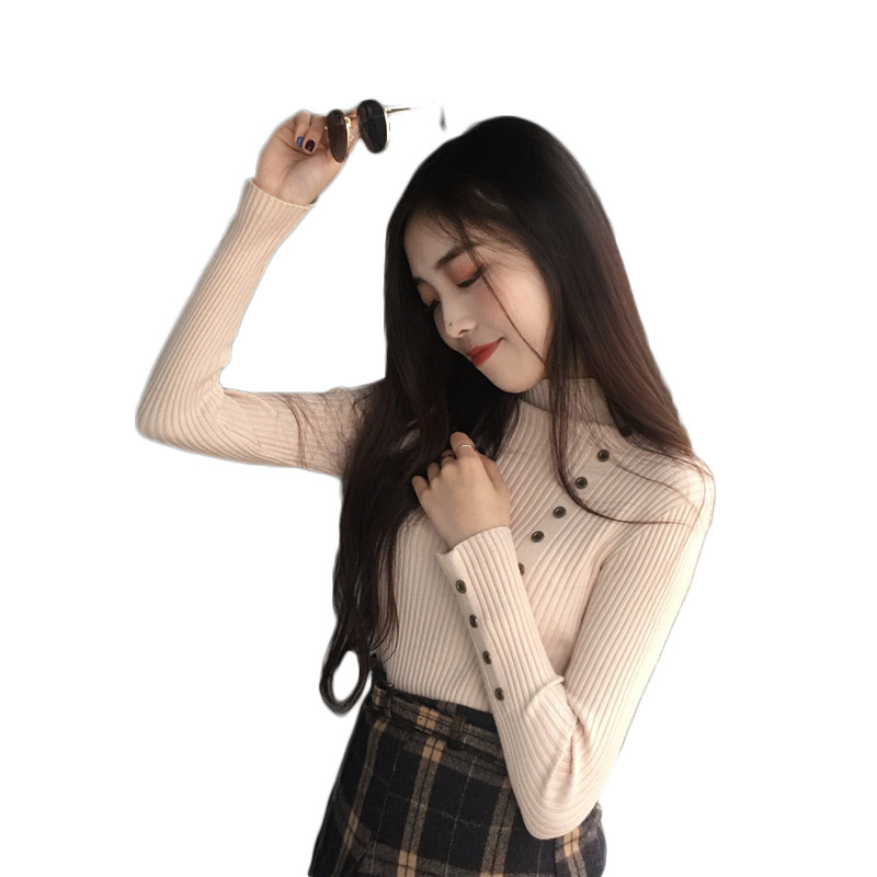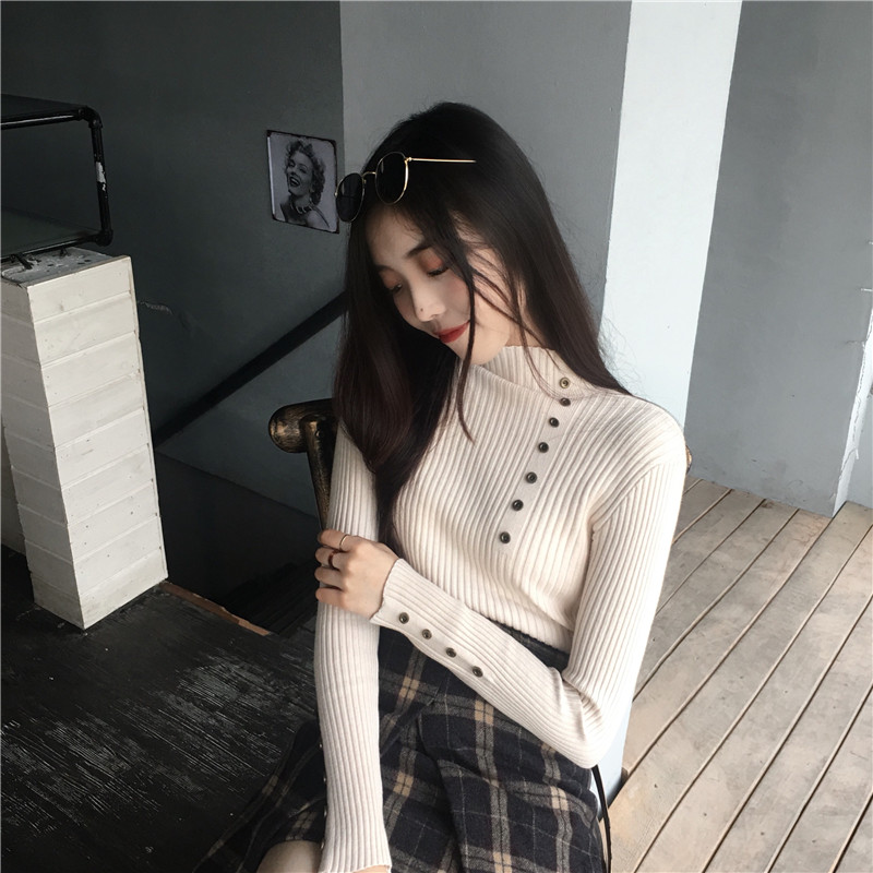 初秋溫柔風毛衣純色半高領紐扣針織衫修身長袖打底套頭加厚女上衣