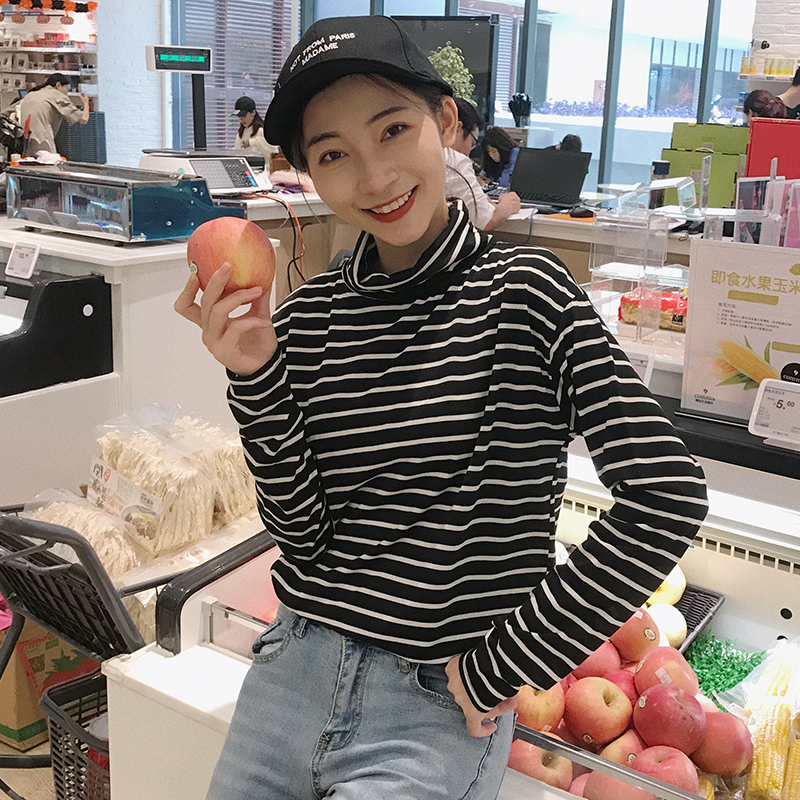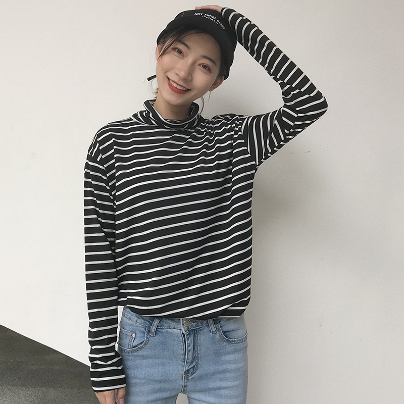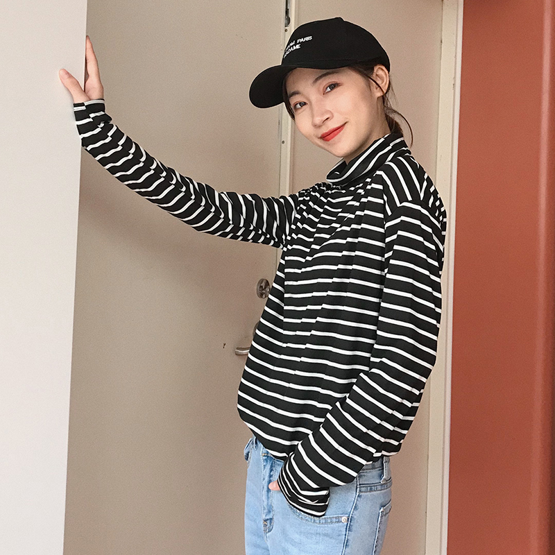 / 時尚條紋高領打底衫女秋冬裝新款彈力長袖上衣學院風外穿套頭T恤