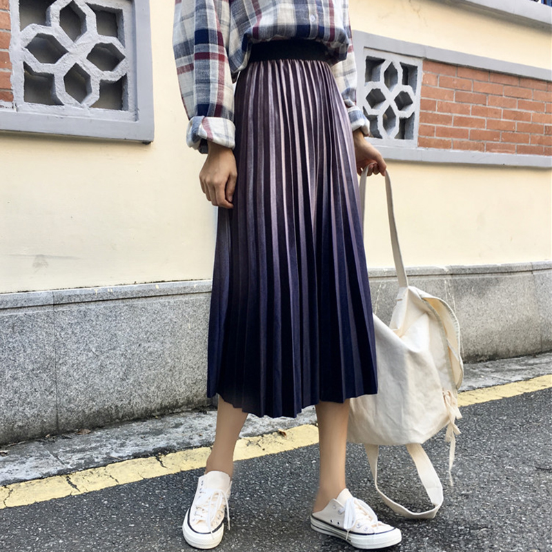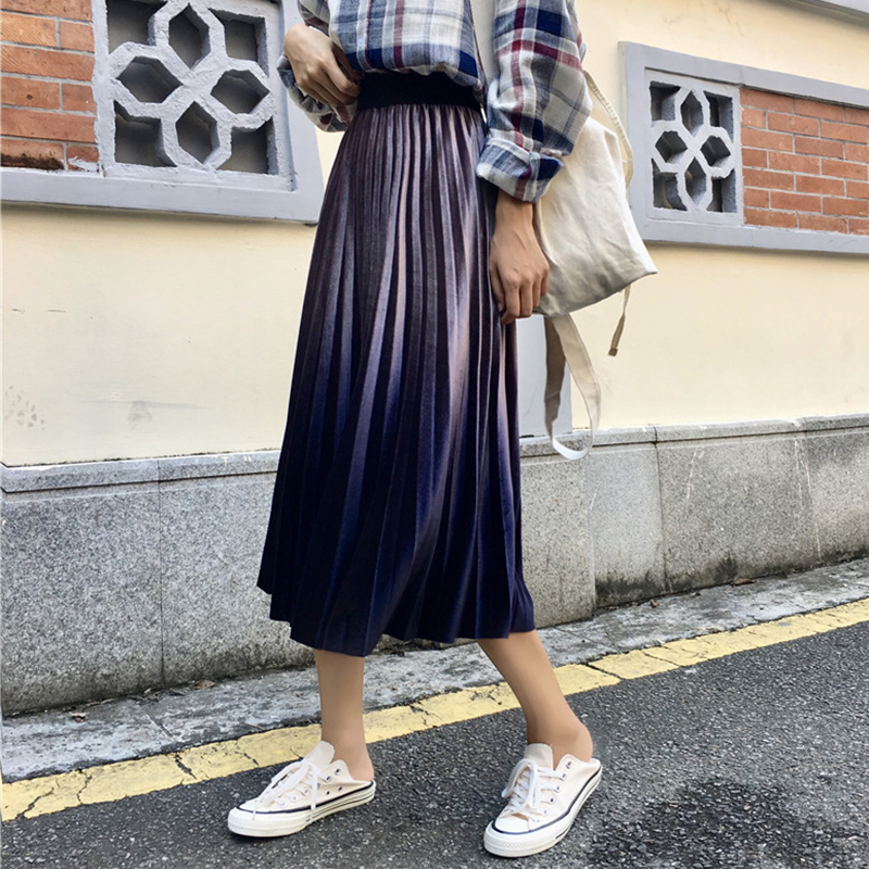 / 秋裝女新款漸變金絲絨百褶裙氣質顯瘦高腰a字半身裙復古中長裙子