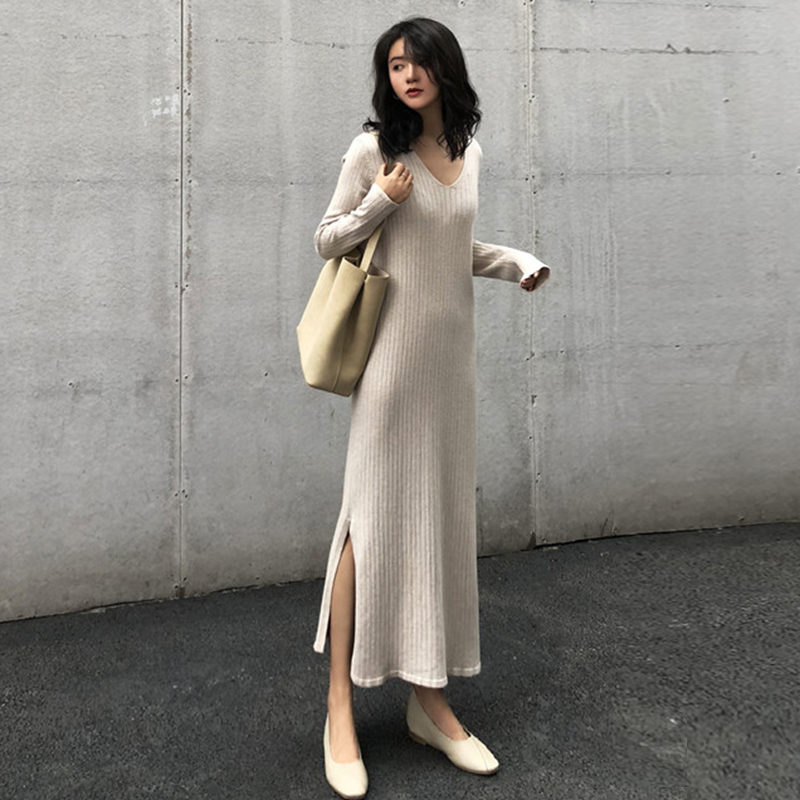 / 氣質v領黑色長袖針織連衣裙子女秋冬裝新款開叉法式復古egg桔梗裙