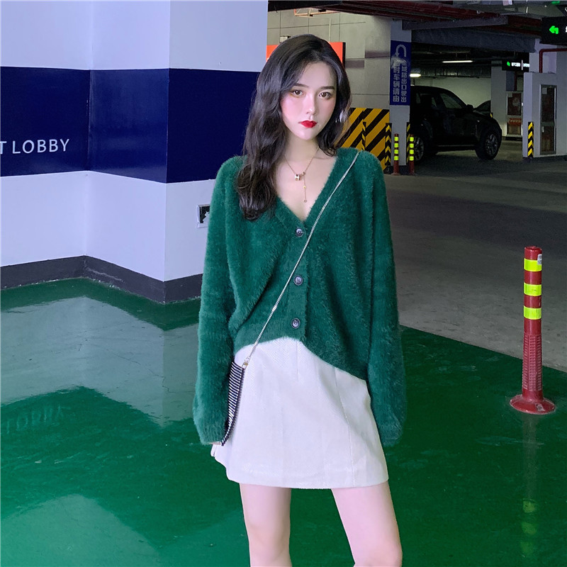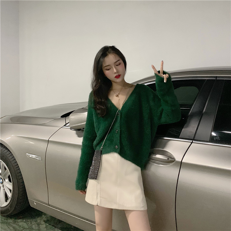 針織衫秋冬慵懶寬松短款毛衣女2018新款外套+高腰包臀皮裙半身裙