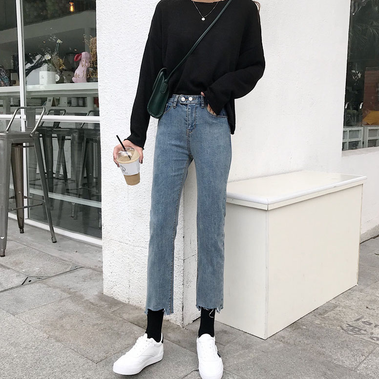 秋裝女2018新款復古港味九分褲學生韓版寬松高腰原宿直筒牛仔褲女