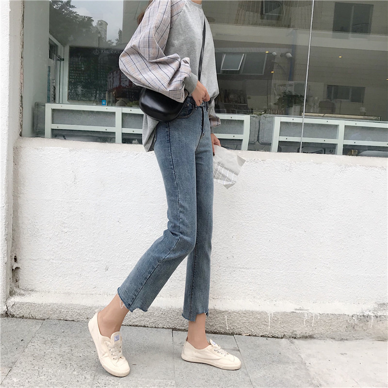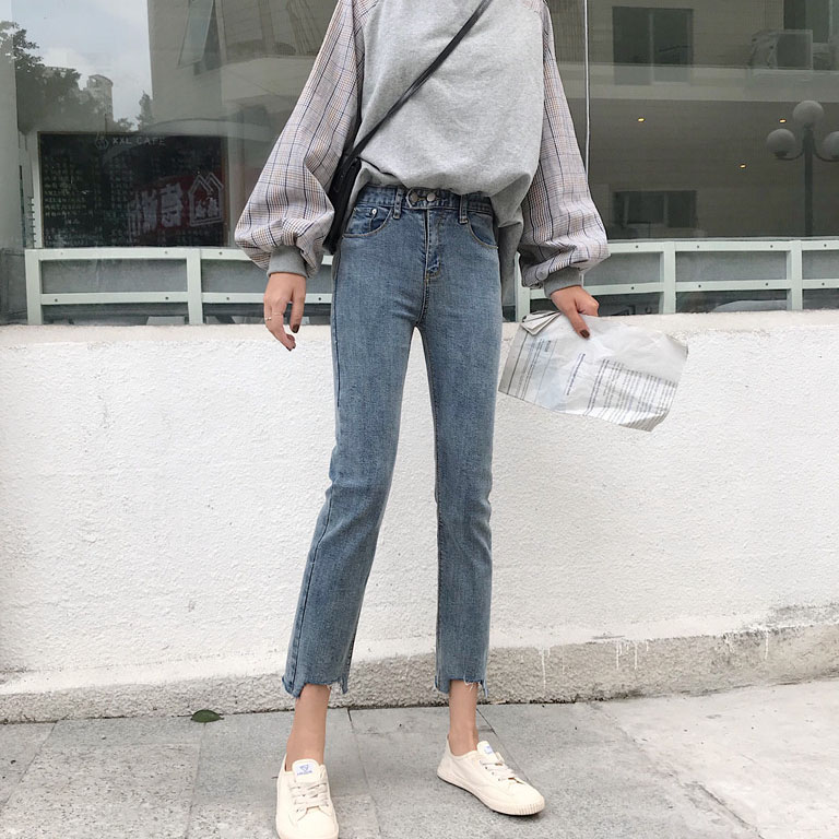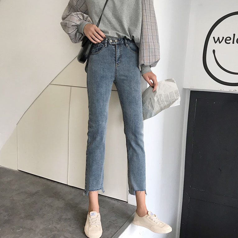 港味復古chic褲子煙灰色破洞高腰顯瘦毛邊牛仔九分小腳褲鉛筆褲潮