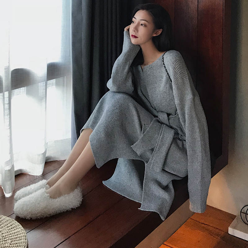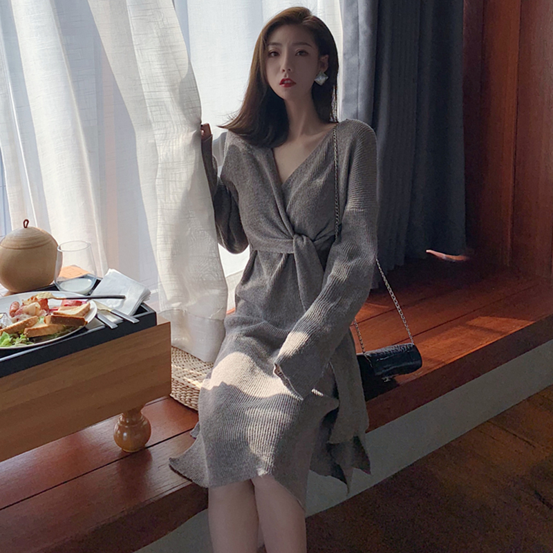 / 氣質V領收腰顯瘦針織連衣裙子女秋冬裝新款復古開叉中長款桔梗裙