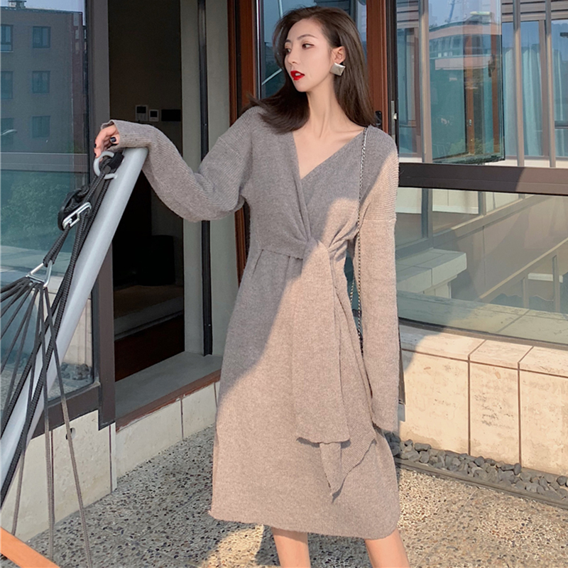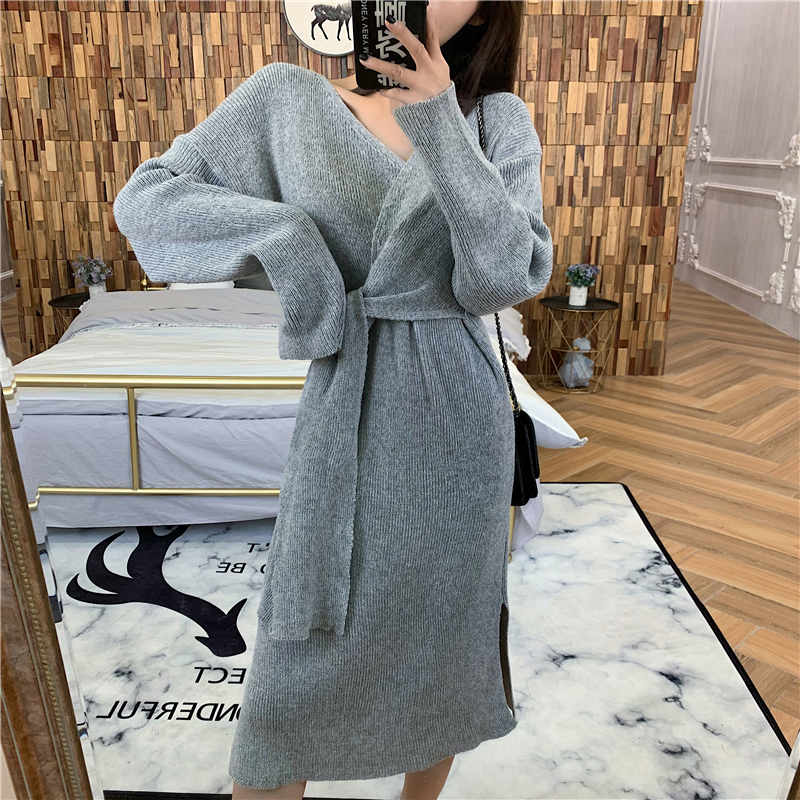 氣質V領收腰顯瘦針織連衣裙子女秋冬裝新款復古開叉中長款桔梗裙