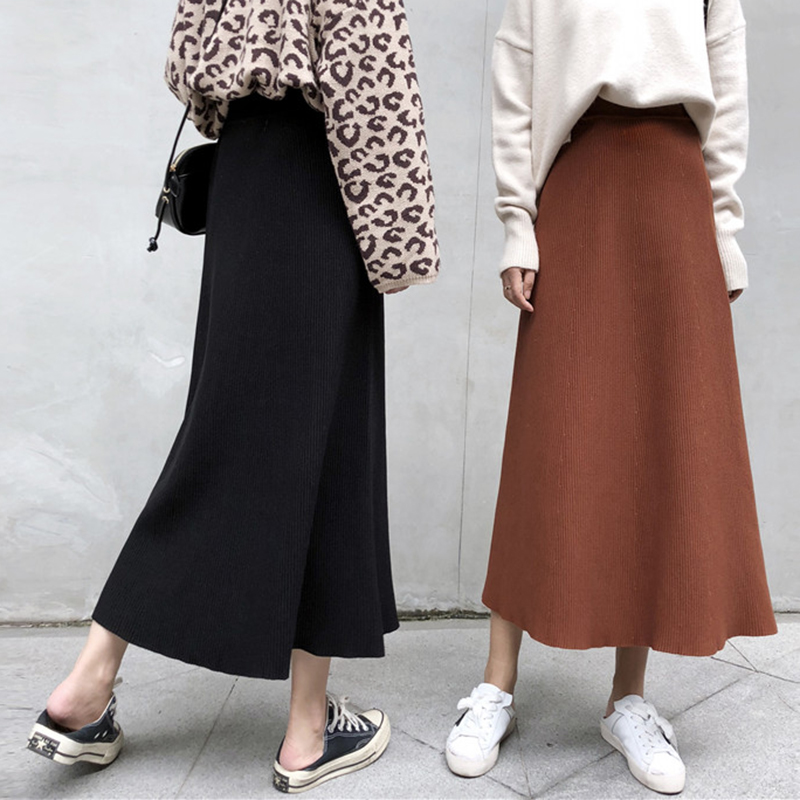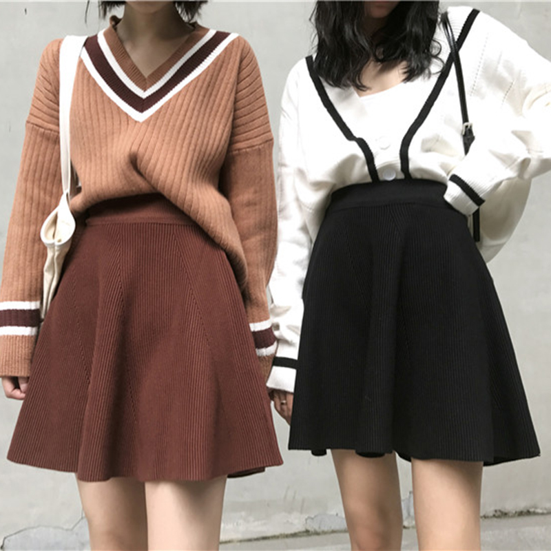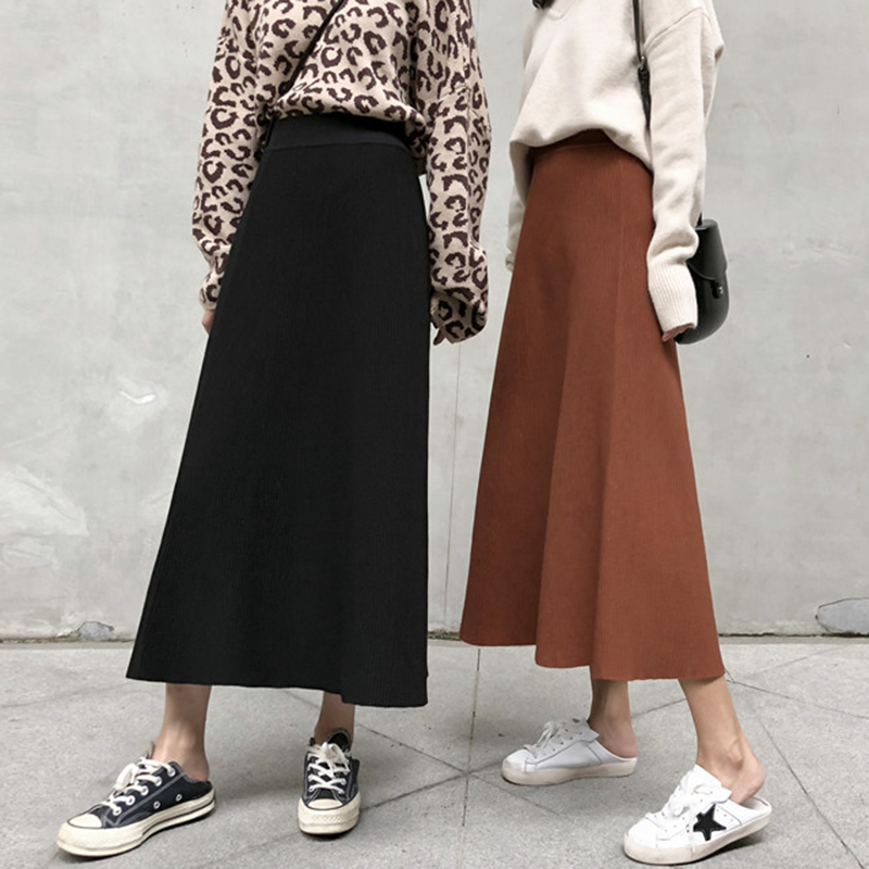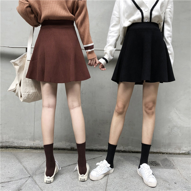/ 針織半身裙女2018秋裝新款學生高腰a字大擺裙顯瘦黑色長裙/短裙子