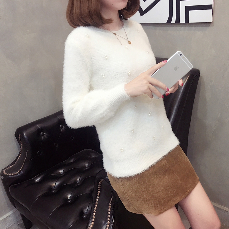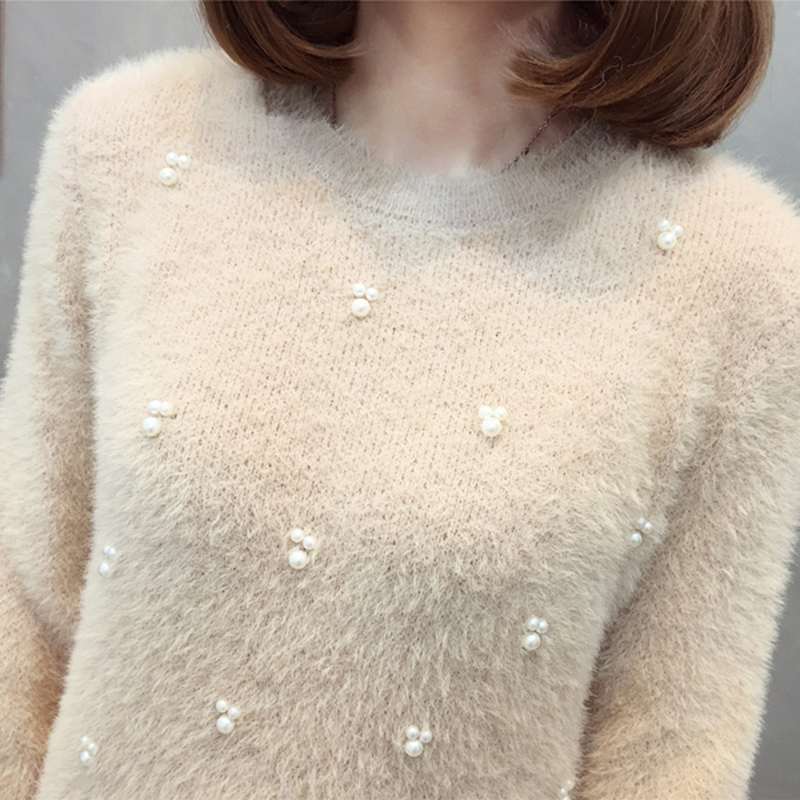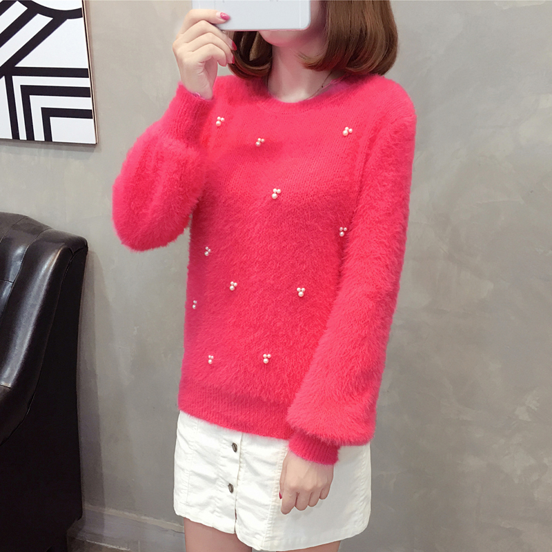 時尚純色釘珠套頭針織衫女冬裝2018新款學生韓版寬松長袖毛衣外套