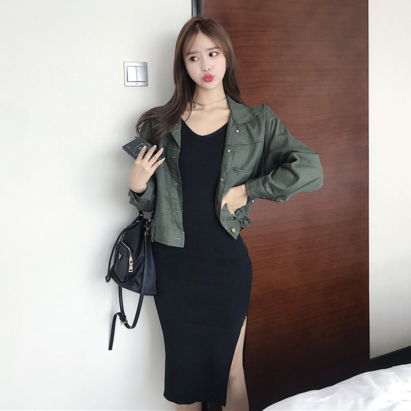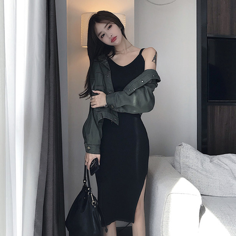兩件套裝女秋新款翻領寬松長袖牛仔短外套氣質開叉針織吊帶連衣裙