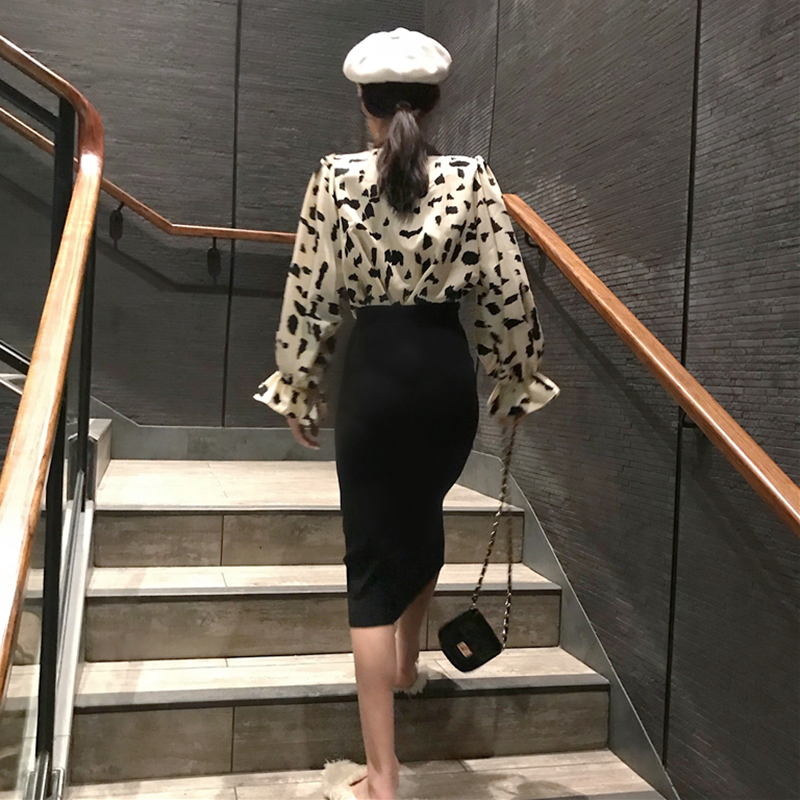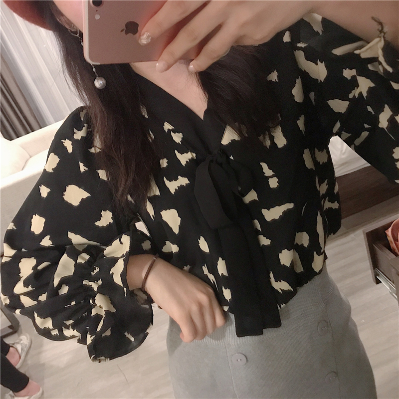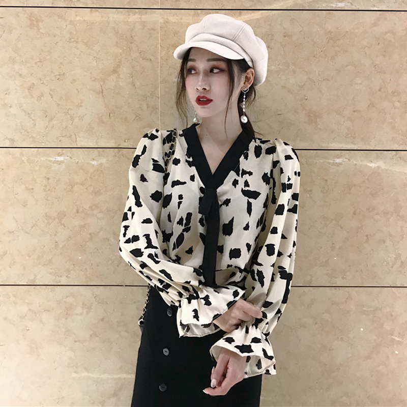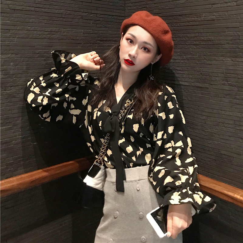 / 氣質chic寬松V領系帶襯衣女秋冬裝2018新款復古印花荷葉長袖襯衫