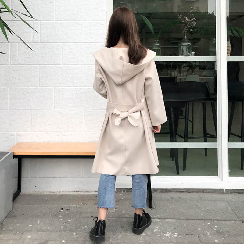 / 中長款流行呢子大衣女冬裝2018新款韓版寬松系帶收腰連帽毛呢外套