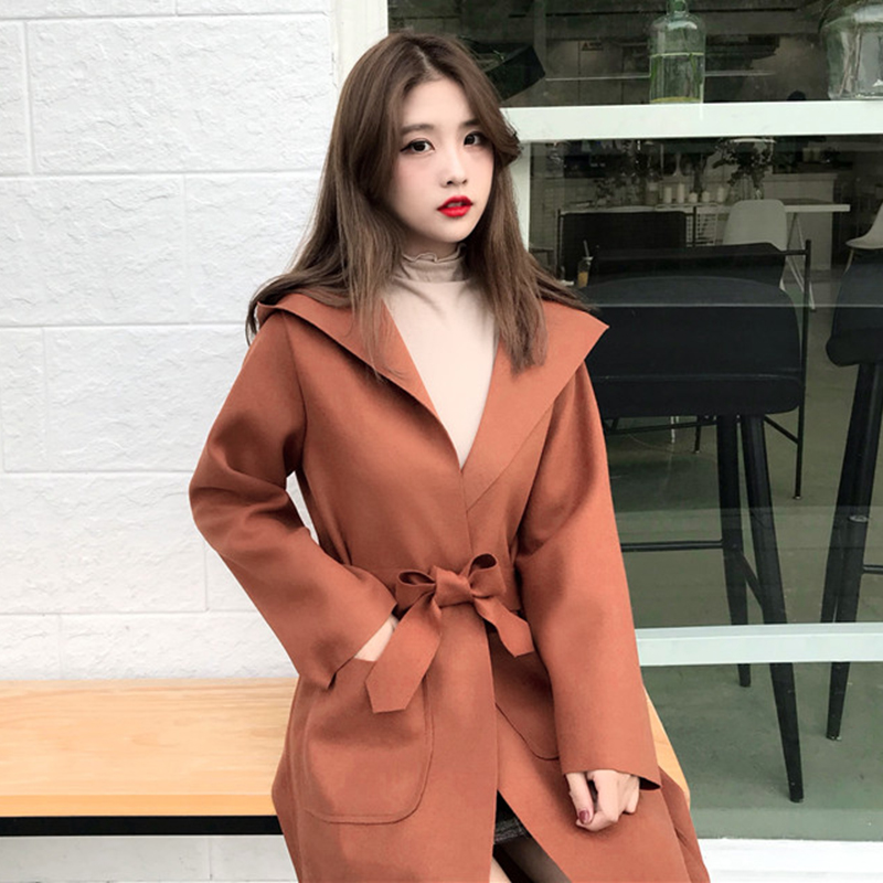 中長款流行呢子大衣女冬裝2018新款韓版寬松系帶收腰連帽毛呢外套