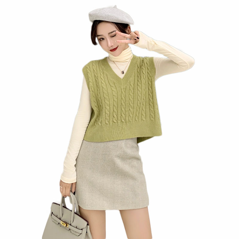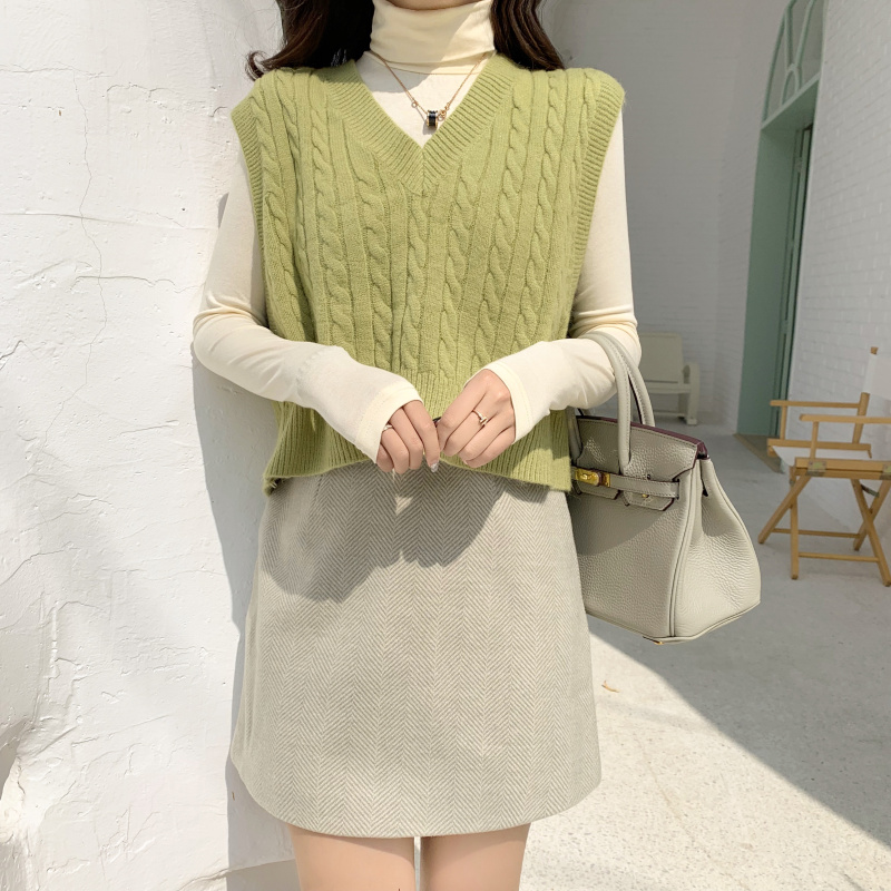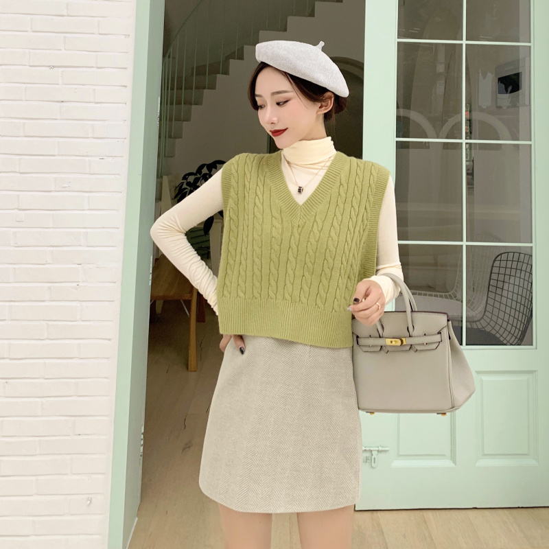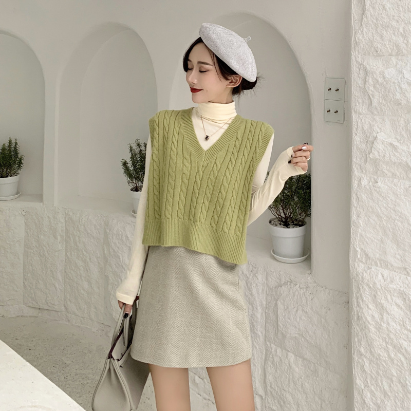 學院風無袖短款馬甲女+高領打底衫+復古條紋毛呢包臀半身裙女套裝