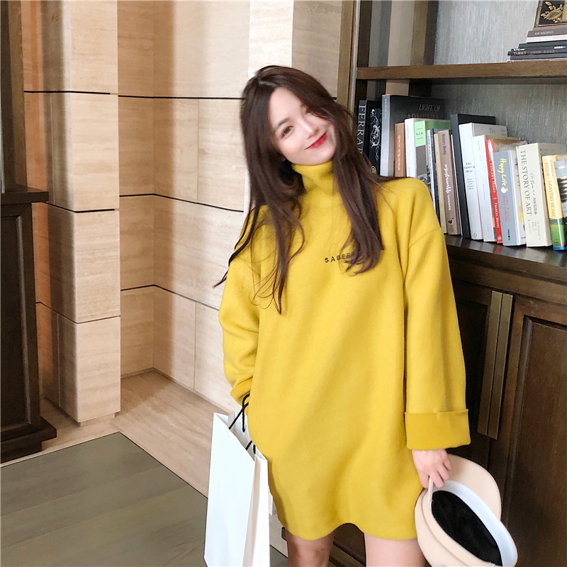 衛衣2018新款女長袖韓版寬松顯瘦oversize印花半高領慵懶長款裙子