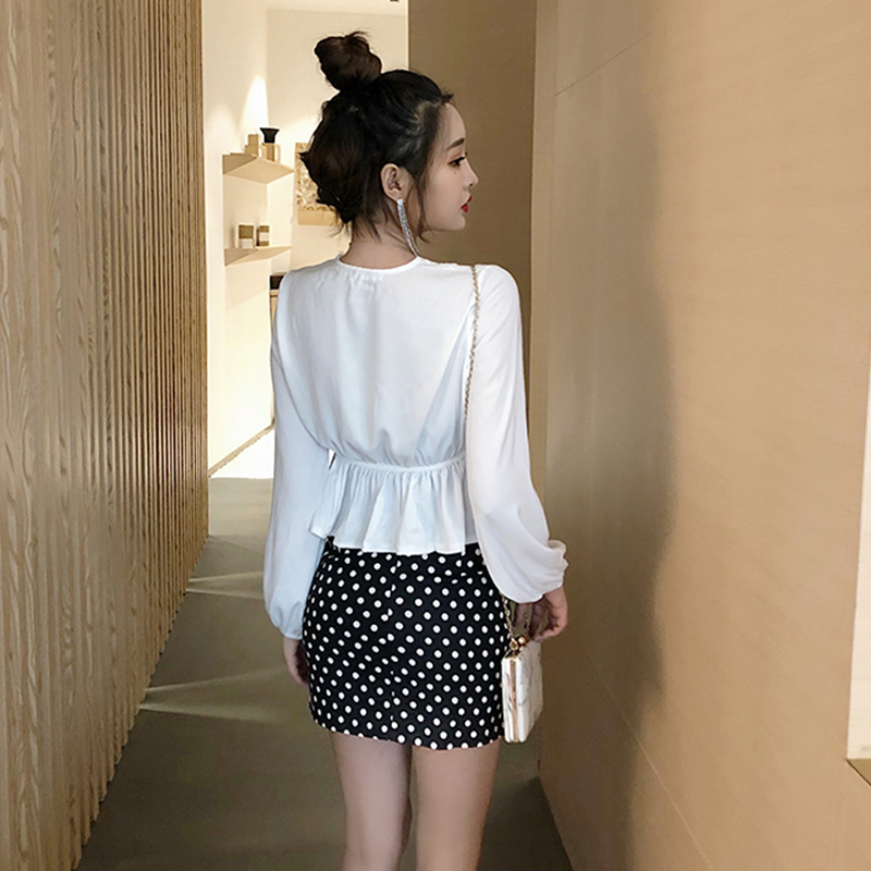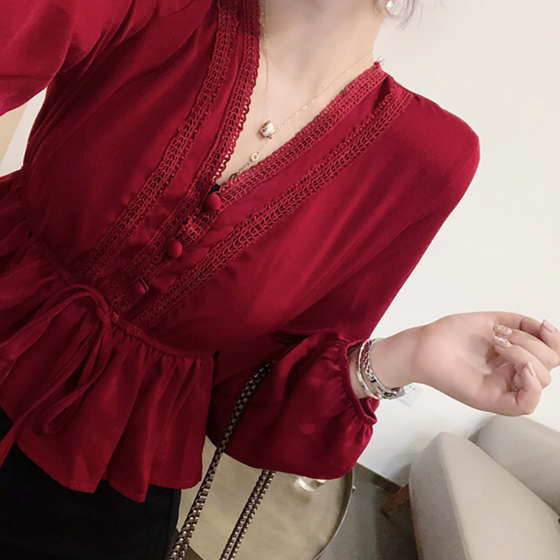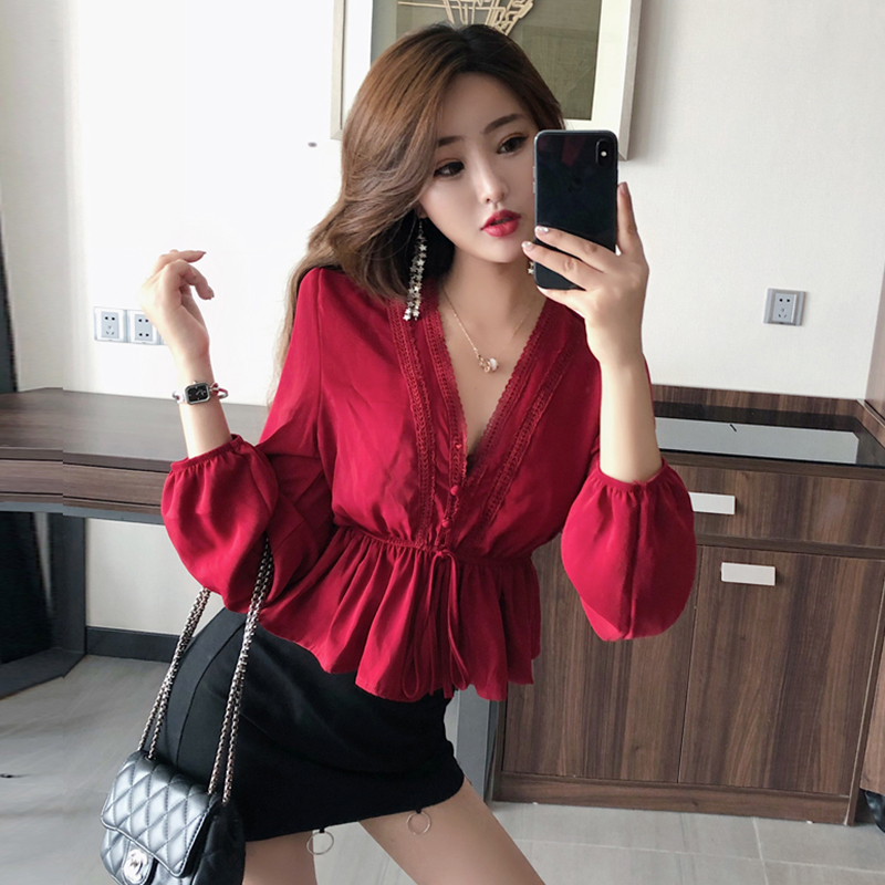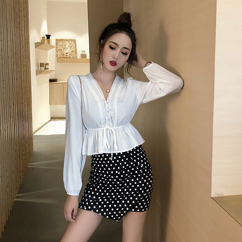 洋氣襯衫秋裝女2018新款氣質蕾絲V領長袖白襯衣高腰短款露臍上衣