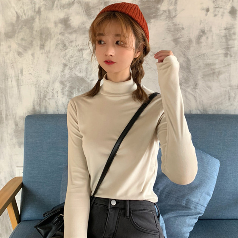 / 半高領修身顯瘦打底衫女秋冬裝新款絲絨保暖長袖上衣學生純色T恤