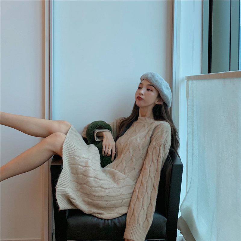 chic秋冬針織衫韓版慵懶百搭寬松質感顯瘦厚實毛衣中長款連衣裙女