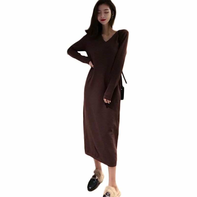 復古chic風毛衣女2018新款修身顯瘦打底針織連衣裙長袖V領長裙潮