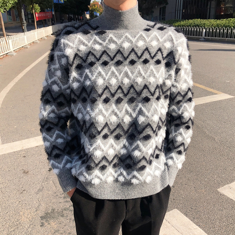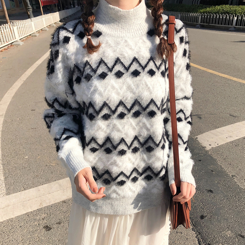 半高領慵懶風毛衣女秋冬情侶裝2018新款時尚拼色針織外套長袖上衣