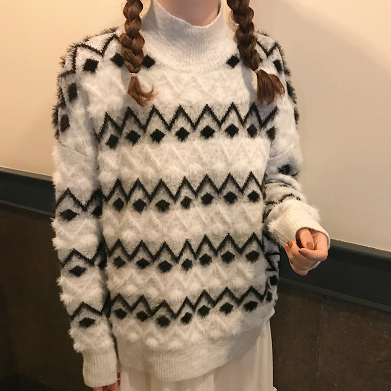 / 半高領慵懶風毛衣女秋冬情侶裝2018新款時尚拼色針織外套長袖上衣
